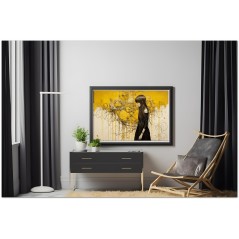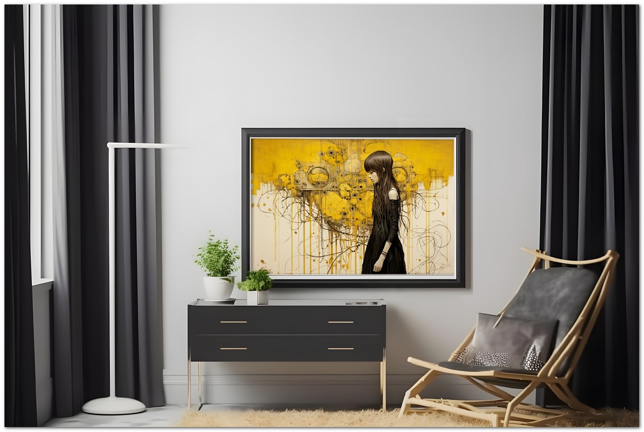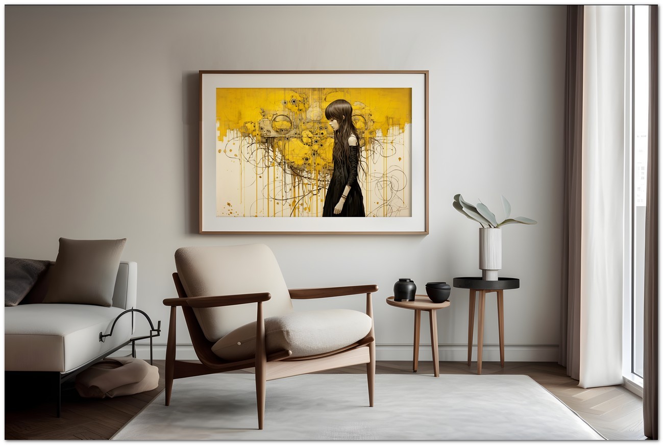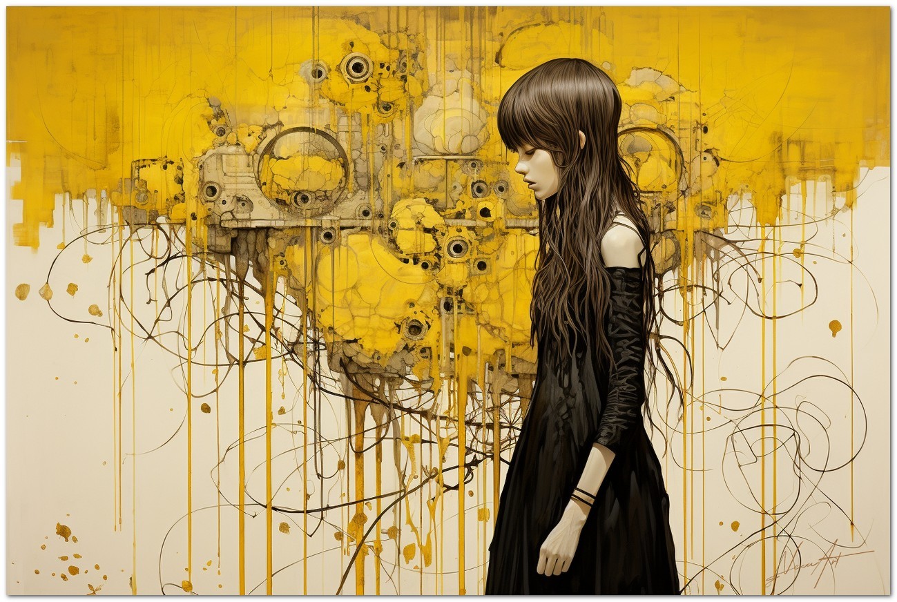 Das Werk zeigt ein Mädchen in einem schwarzen Kleid, das vor einem abstrakten gelben Hintergrund steht. Ihre geschlossenen Augen lassen vermuten, dass das, was der Beobachter um sie herum sieht, ihre Gedanken sind, als würde uns ihr Geist offenbart. Aufgrund der detaillierten und getreuen Darstellung natürlicher Elemente kann das Werk mit dem Bildstil des Realismus in Verbindung gebracht werden. Über diese Arbeit: Klassifizierung, Techniken und Stile