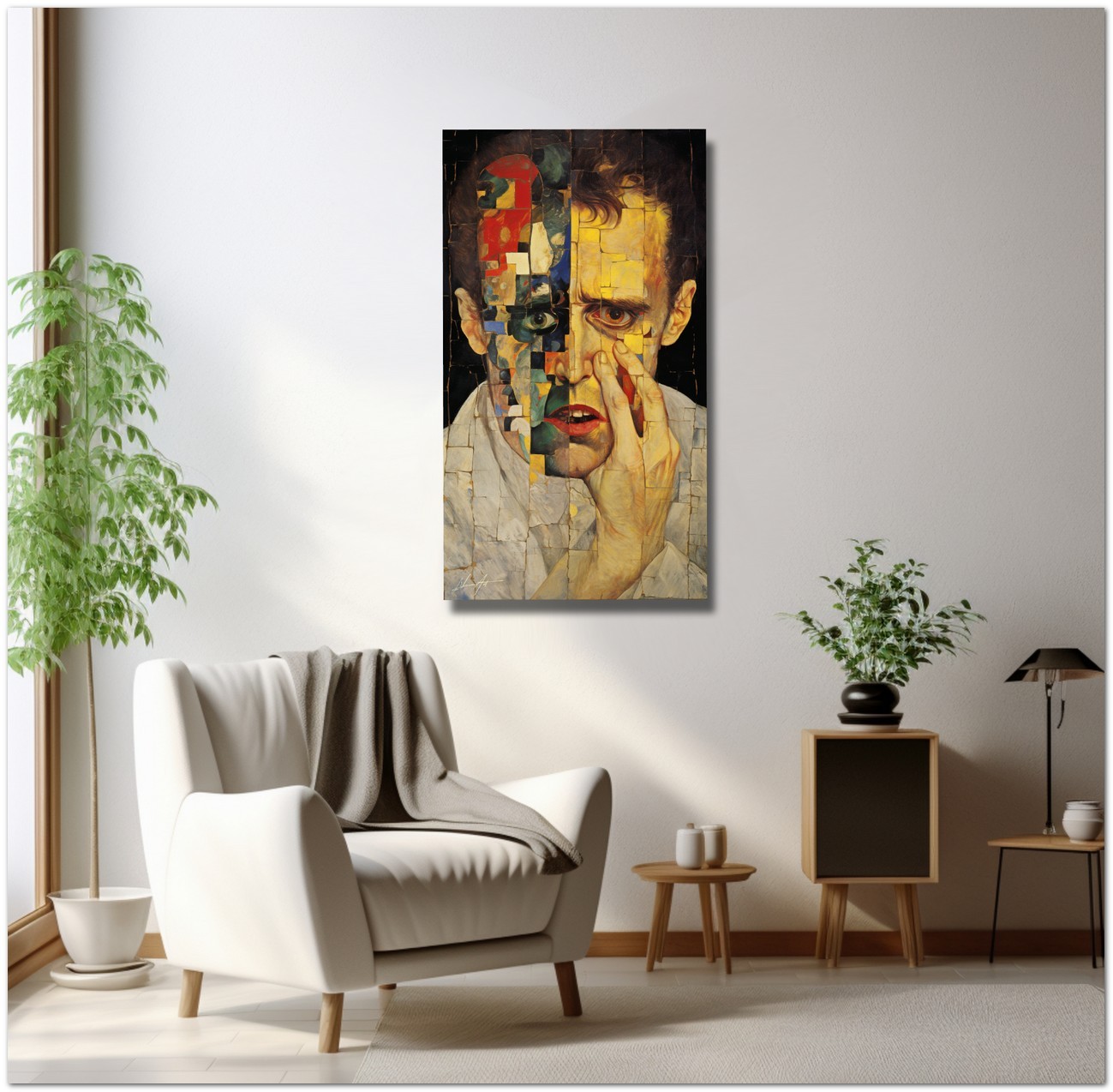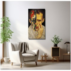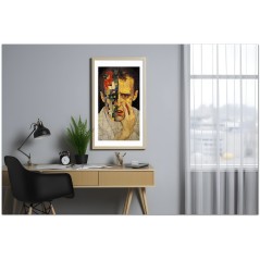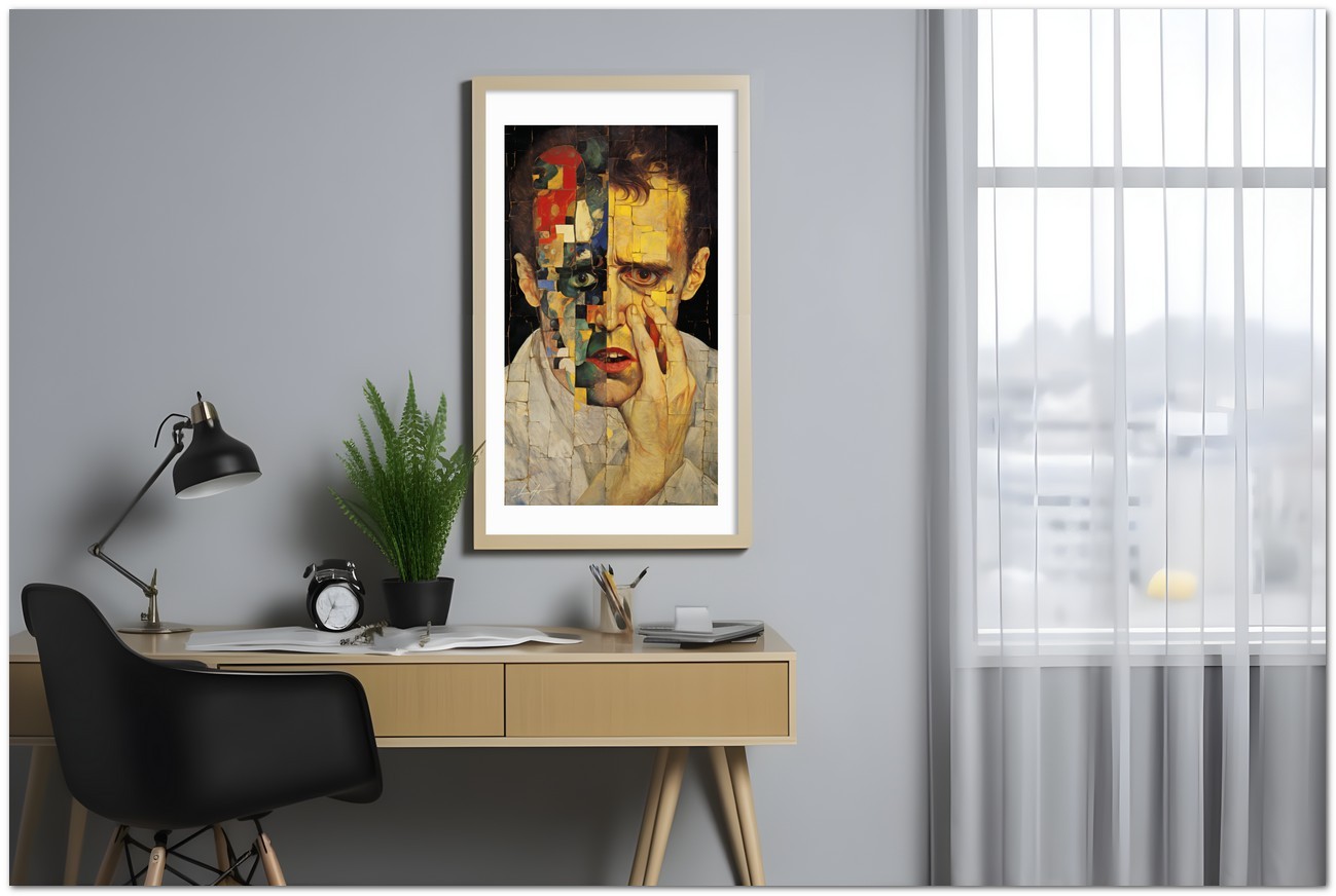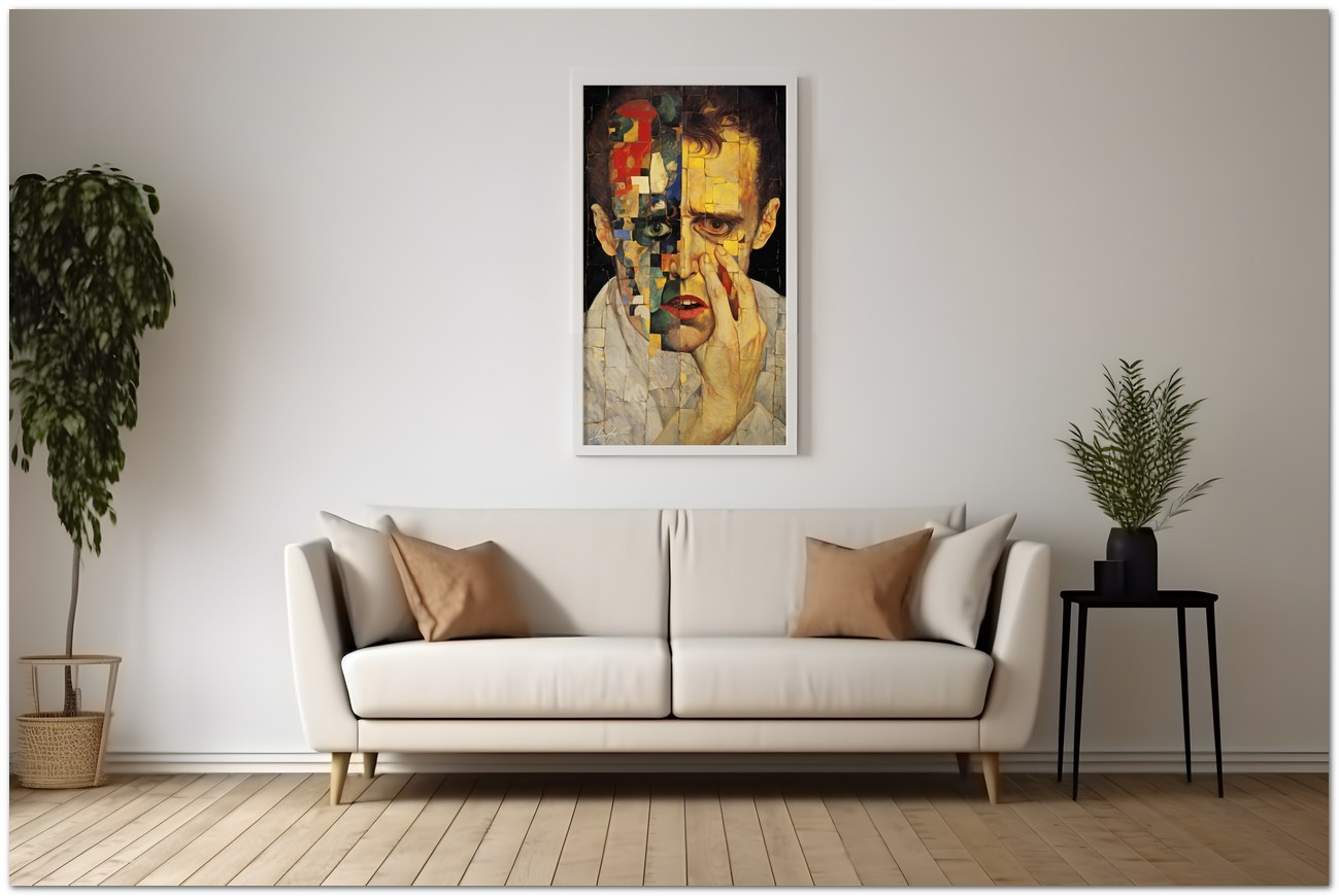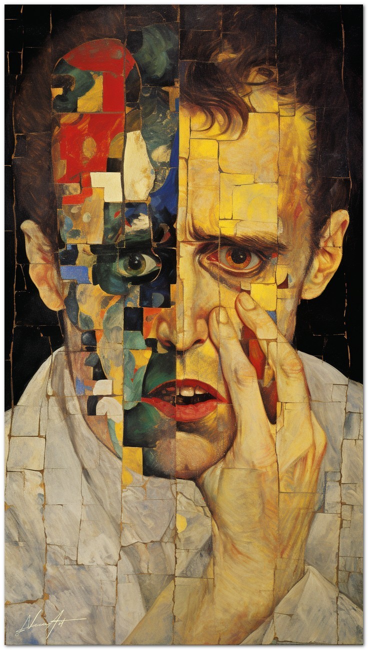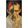Das Werk präsentiert ein männliches Gesicht als zentrales Element, teils realistisch, teils mosaikartig. Dieses Gesicht wird auf einzigartige Weise dargestellt und zeigt verschiedenfarbige Gesichter innerhalb desselben Gemäldes, was die Komplexität und Vielfalt des Menschen symbolisiert. Aufgrund der detaillierten und getreuen Darstellung natürlicher Elemente kann das Werk mit dem Bildstil des Realismus in Verbindung gebracht werden. Über diese Arbeit: Klassifizierung, Techniken und Stile