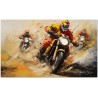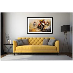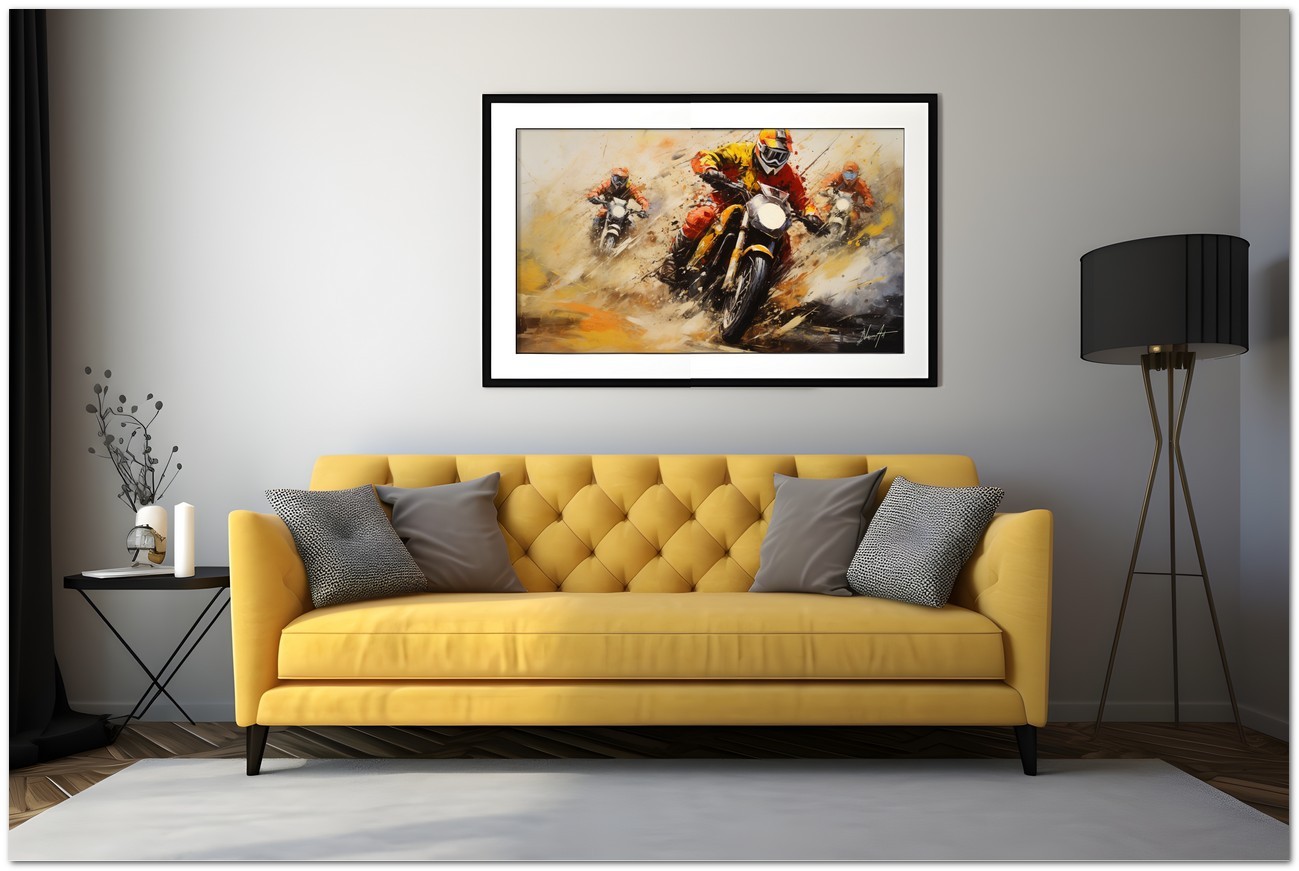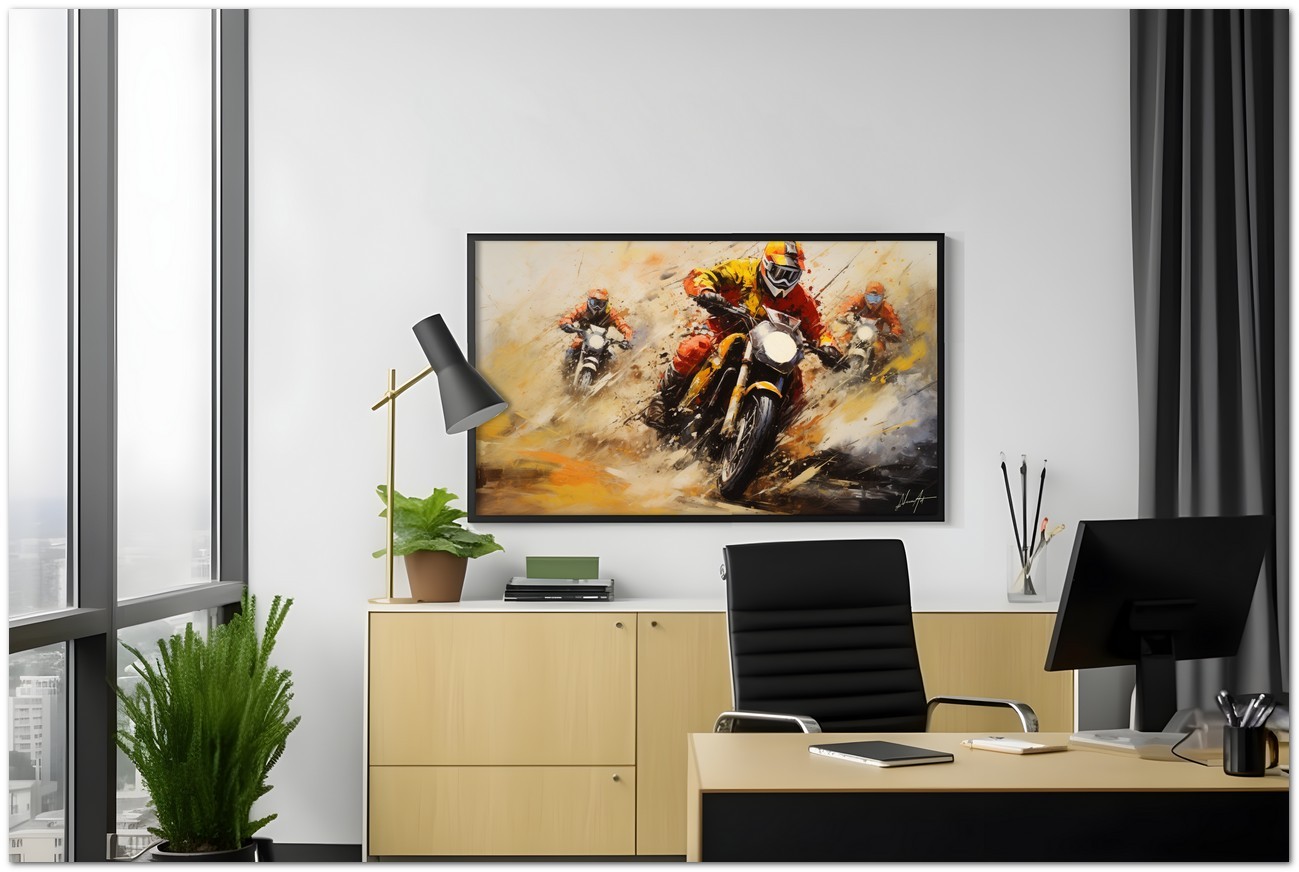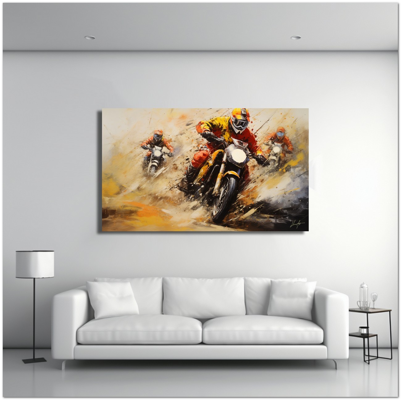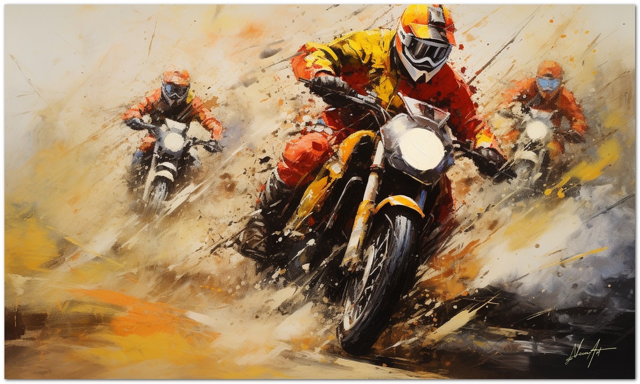 Das Werk zeigt drei Motocross-Fahrer in voller Aktion und fängt die Essenz von Geschwindigkeit, Agilität und Leidenschaft für diesen Extremsport ein. Die Motorradfahrer scheinen mit ihrer dynamischen Haltung der Schwerkraft zu trotzen und sorgen für einen Moment puren Adrenalins. Die von Gelb-, Braun- und Schwarztönen dominierte Farbpalette betont die Bewegung und Intensität der Szene. Aufgrund der detaillierten und getreuen Darstellung natürlicher Elemente kann das Werk mit dem Bildstil des Realismus in Verbindung gebracht werden. Über diese Arbeit: Klassifizierung, Techniken und Stile