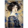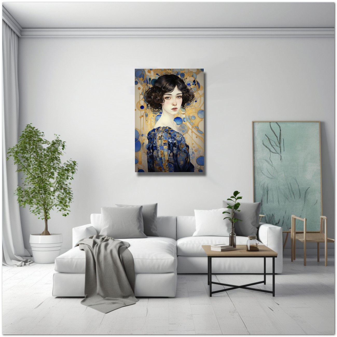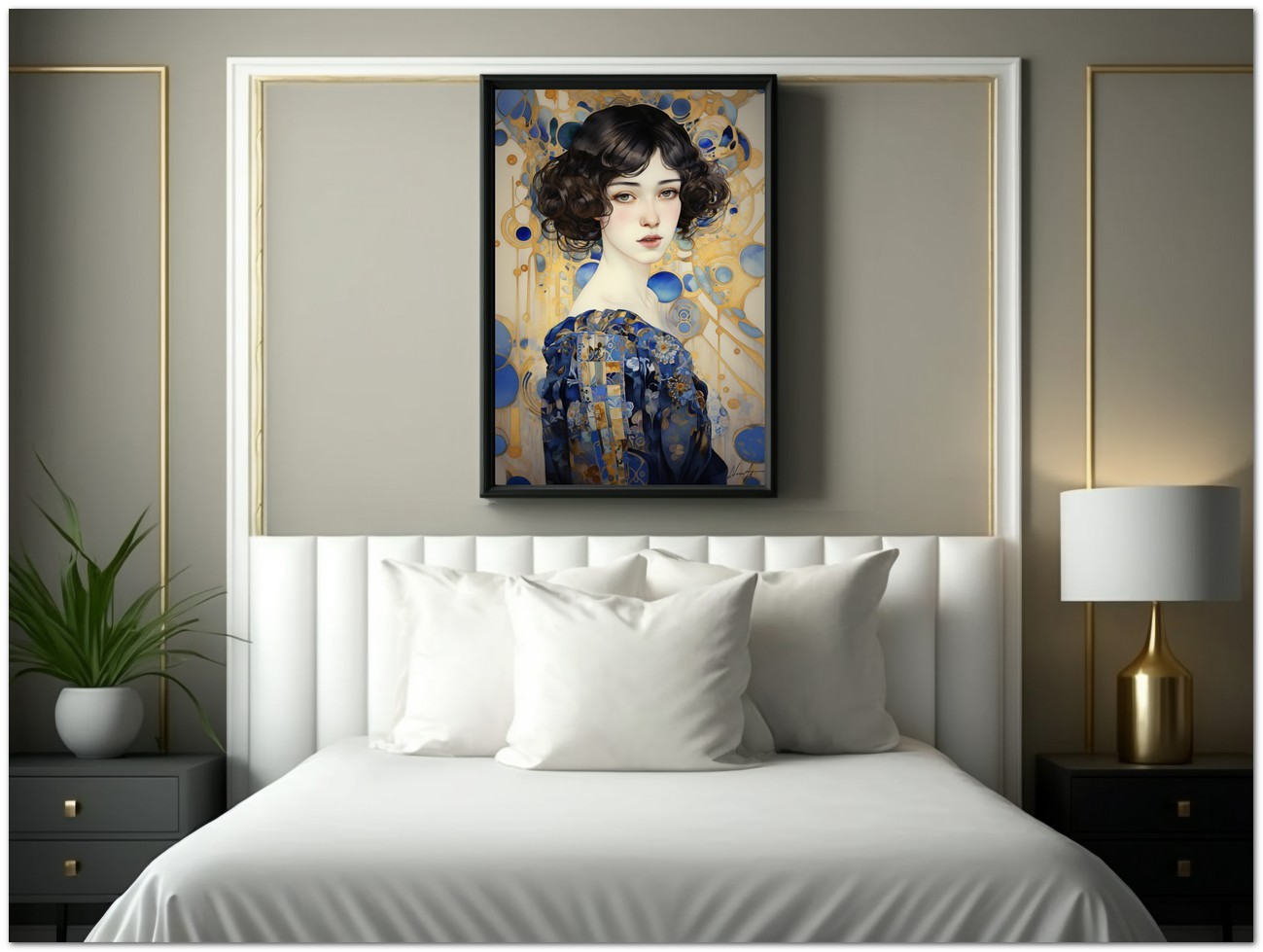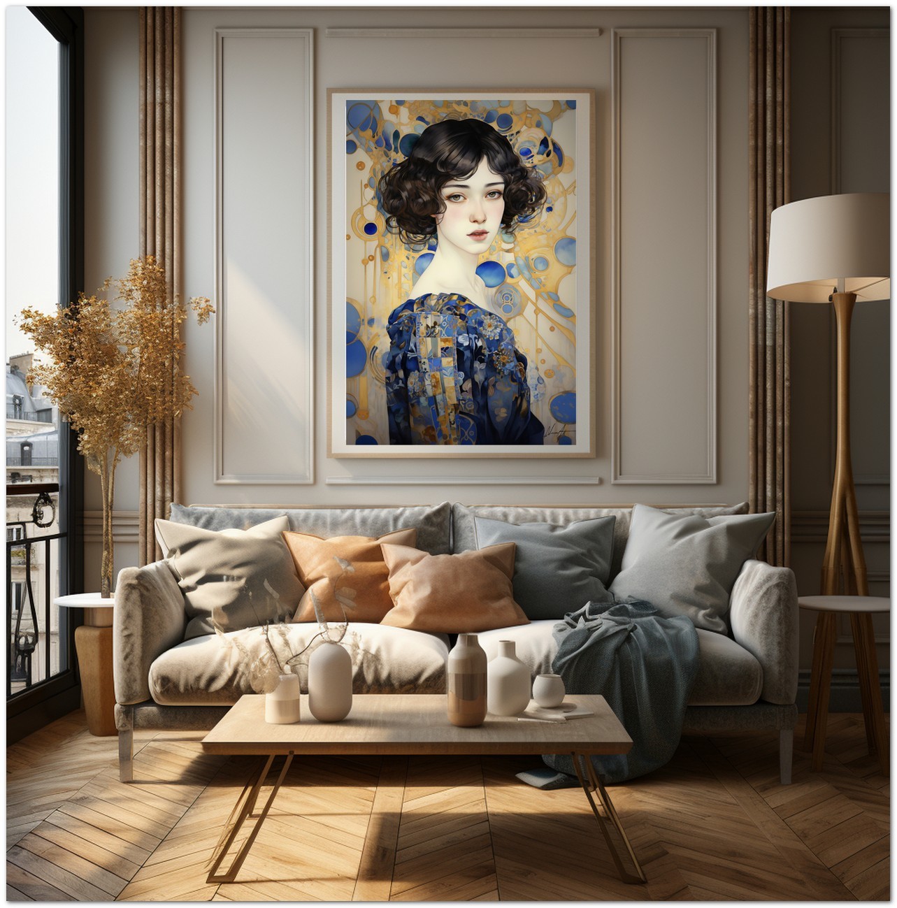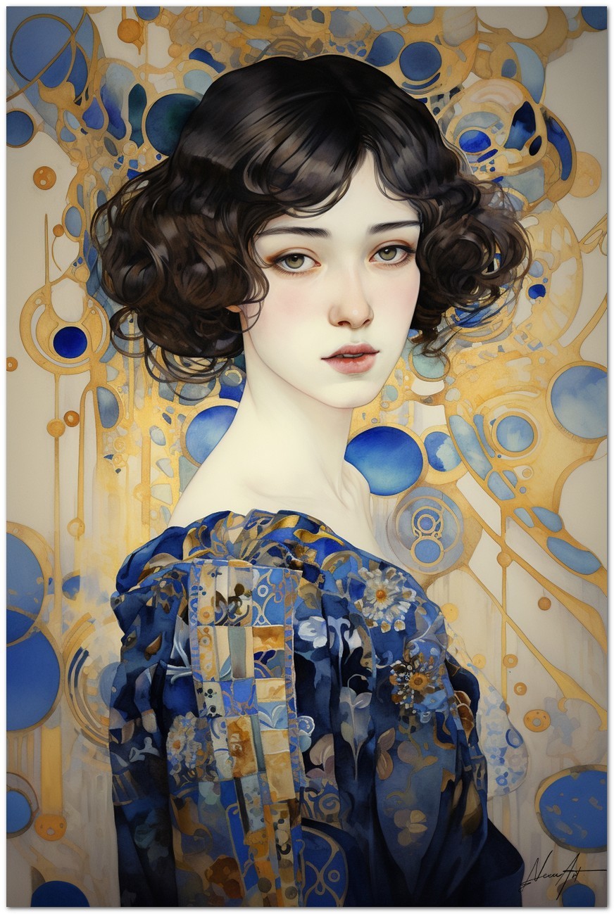 Das Gemälde zeigt eine Frau in einem eleganten blauen Kleid, deren Haar in voluminösen Locken um ihre Schultern fällt. Ihre durchdringenden Augen und zarten Gesichtszüge sind außergewöhnlich detailliert wiedergegeben und lenken die Aufmerksamkeit auf ihr ausdrucksstarkes Gesicht. Aufgrund der detaillierten und getreuen Darstellung natürlicher Elemente kann das Werk mit dem Bildstil des Realismus in Verbindung gebracht werden. Über diese Arbeit: Klassifizierung, Techniken und Stile