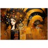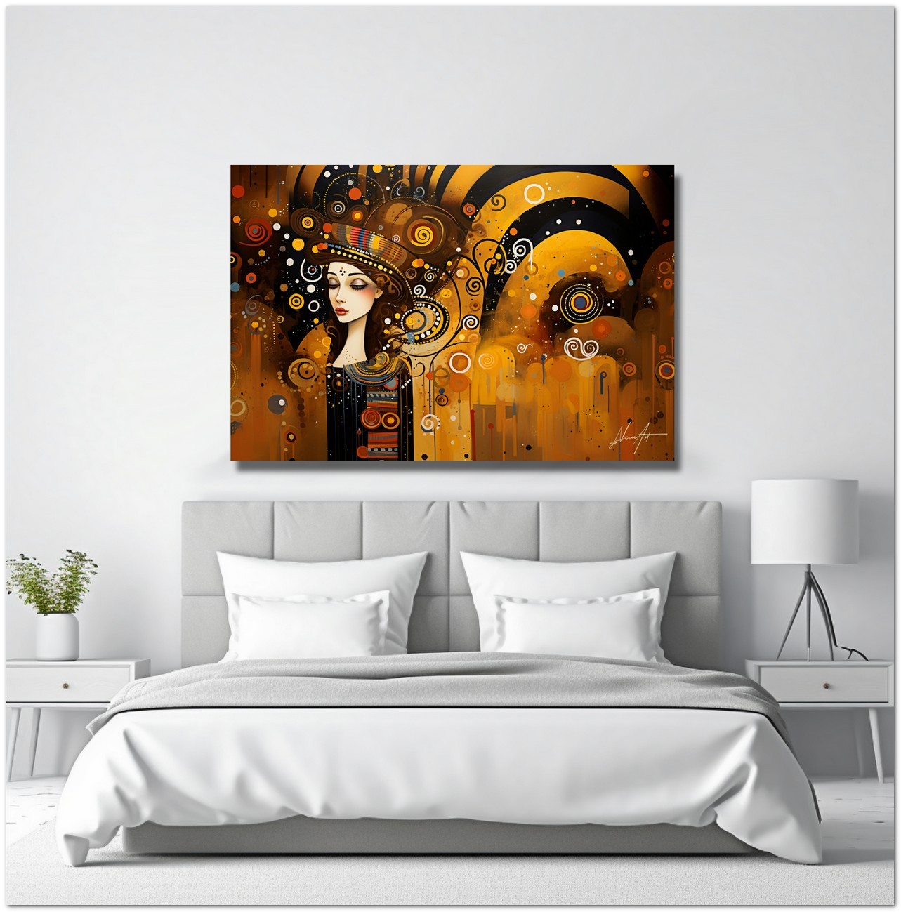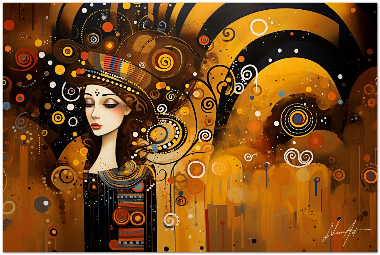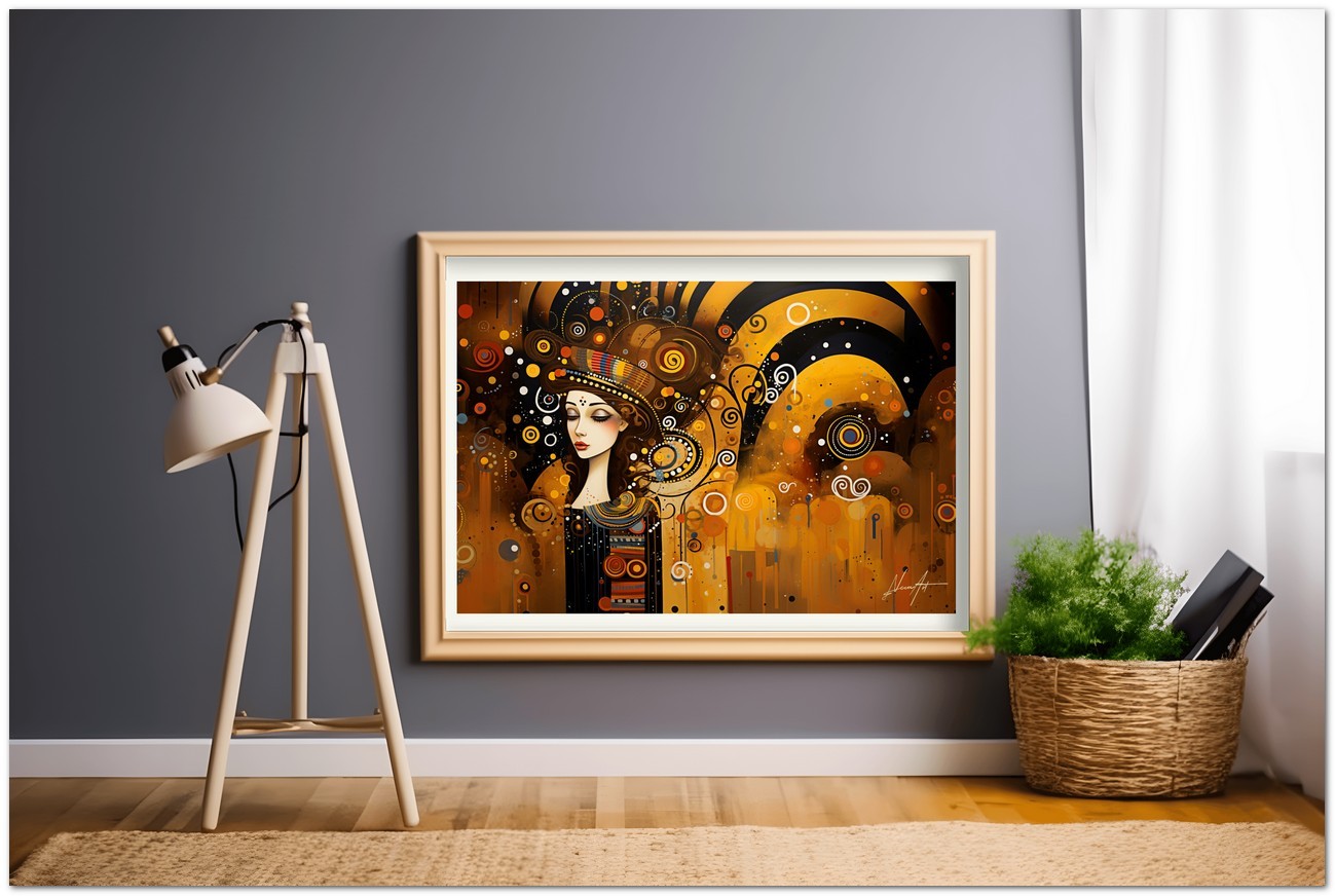 Dieses digitale Werk Melodia Visiva ist eine Explosion abstrakter Formen und leuchtender Farben, die Kreise und Spiralen zu einer dynamischen und ansprechenden Komposition verflechten. Im Zentrum taucht aus diesem Meer der Bewegung eine heitere und stilisierte Frauenfigur auf, wie ein Leuchtfeuer der Ruhe und Schönheit. Die warme Farbpalette vermittelt ein Gefühl von Wärme und Gemütlichkeit, während der kühne Einsatz von Kontrasten und die fließende Anordnung geometrischer Elemente dem Bild einen fast musikalischen visuellen Rhythmus verleihen. Kreativer Prozess und Innovation
