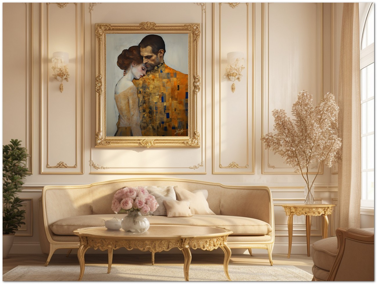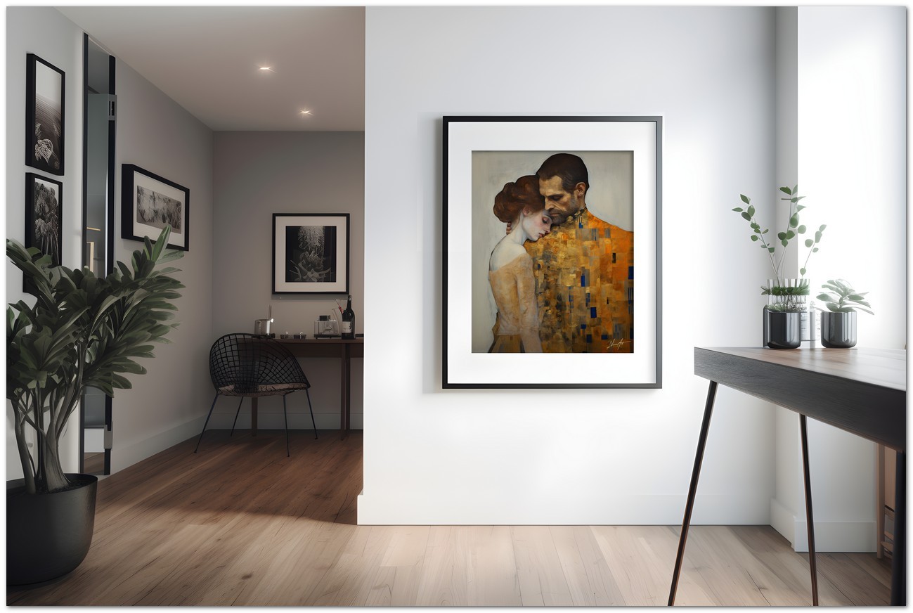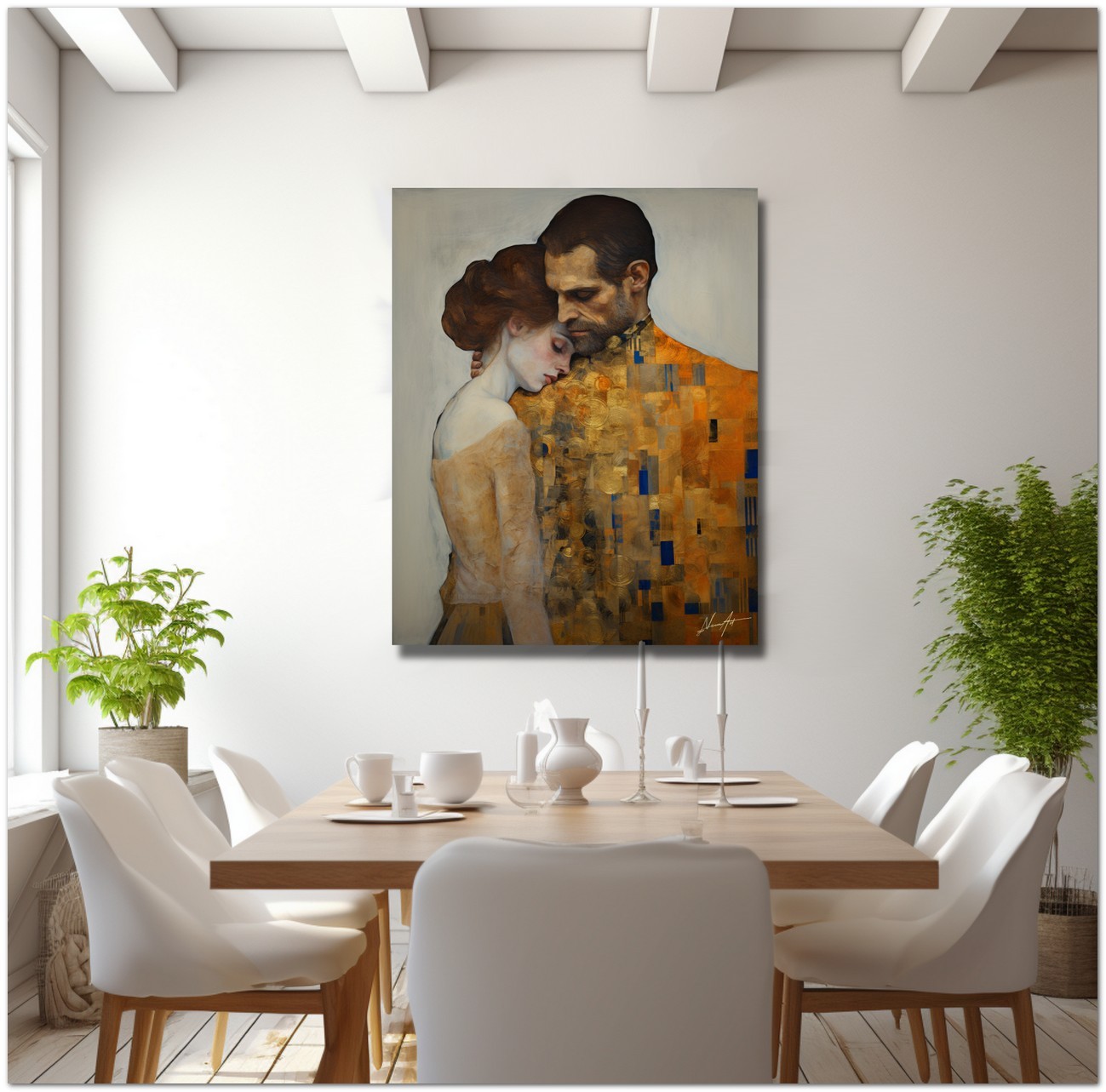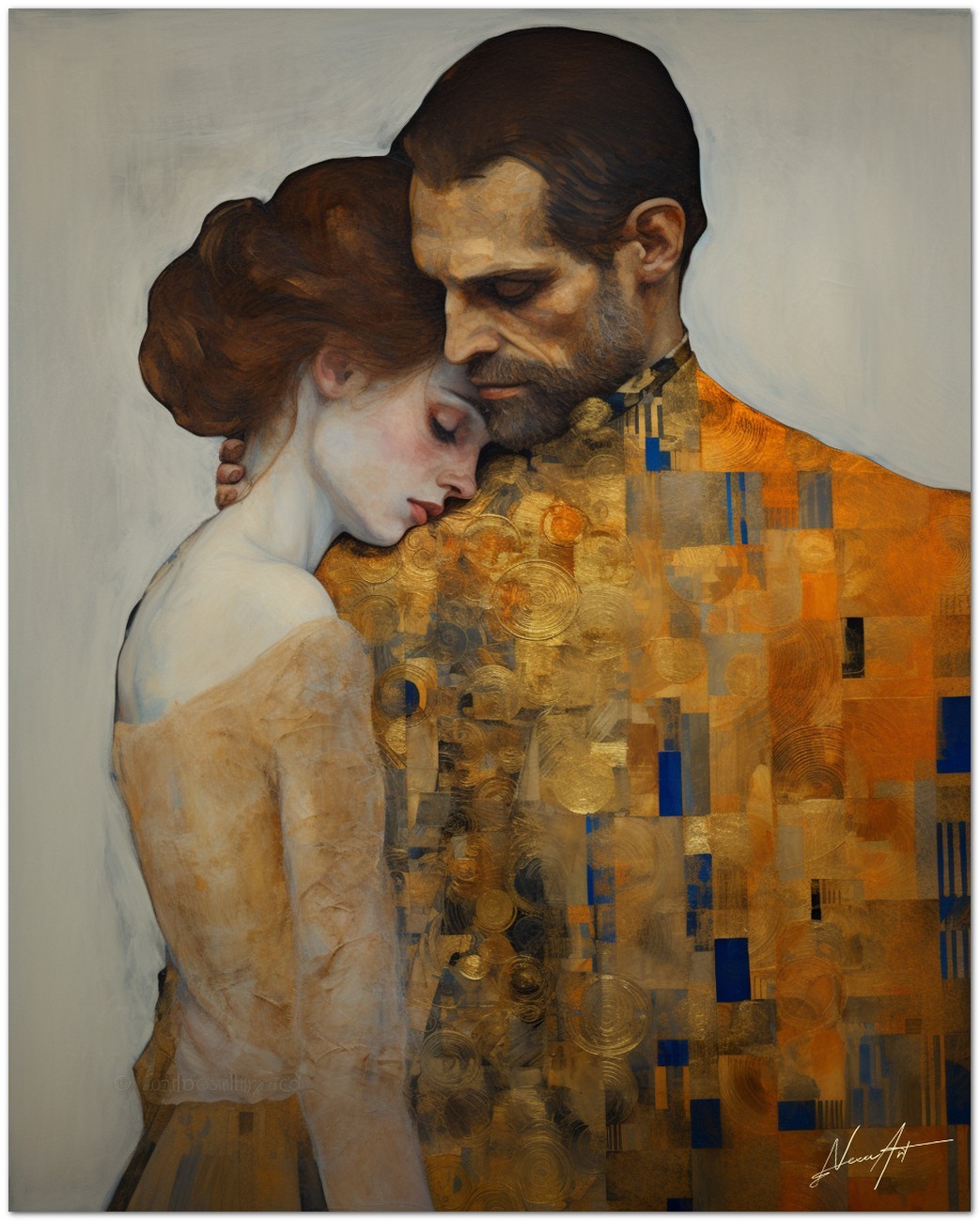 Dieses künstlerische Werk Intreccio Temporale fängt einen Moment der stillen Verbindung zwischen zwei Figuren ein. Die Frau, deren Kopf auf der Schulter des Mannes ruht, scheint sich in einem Moment des Nachdenkens oder in süßer Hingabe zu verlieren. Ein Teil des Mannes verschmilzt mit einem komplexen geometrischen Muster, das eine Auflösung in der Zeit oder in der Erinnerung andeutet und möglicherweise auf die verschiedenen Gesichter und Phasen seines Lebens hinweist. Kreativer Prozess und Innovation