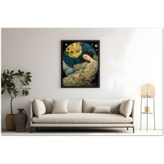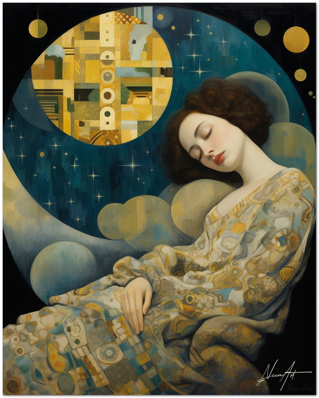 Das Werk Sognando l'Infinito verewigt einen Moment ätherischer Stille, in dem eine Frau schläft, eingebettet in eine abstrakte Welt, die an den Nachthimmel erinnert. Seine Kleidung verschmilzt mit einer Landschaft aus geometrischen Formen, die an Himmelskörper erinnern, und stellt so eine visuelle Verbindung zwischen irdischem Schlaf und dem Kosmos her. Dieses Porträt, das menschliche Ruhe mit der Unermesslichkeit des Universums verbindet, lädt uns ein, über die Verbindung zwischen unserer inneren Welt und den unendlichen Räumen, die uns umgeben, nachzudenken. Kreativer Prozess und Innovation
