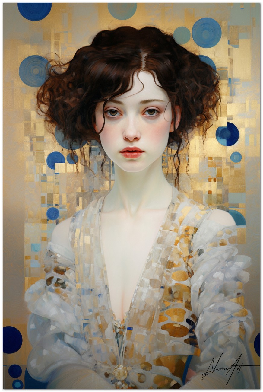 In dieser digitalen Arbeit taucht der Protagonist vor einem Hintergrund auf, der zwischen Dämmerung und Morgengrauen verblasst. Ihr versunkener Blick und ihr durchsichtiger Teint heben sich von einem Stoff aus kreisförmigen Elementen ab, die zwischen Mitternachtsblautönen und goldenen Akzenten tanzen. Kreativer Prozess und Innovation