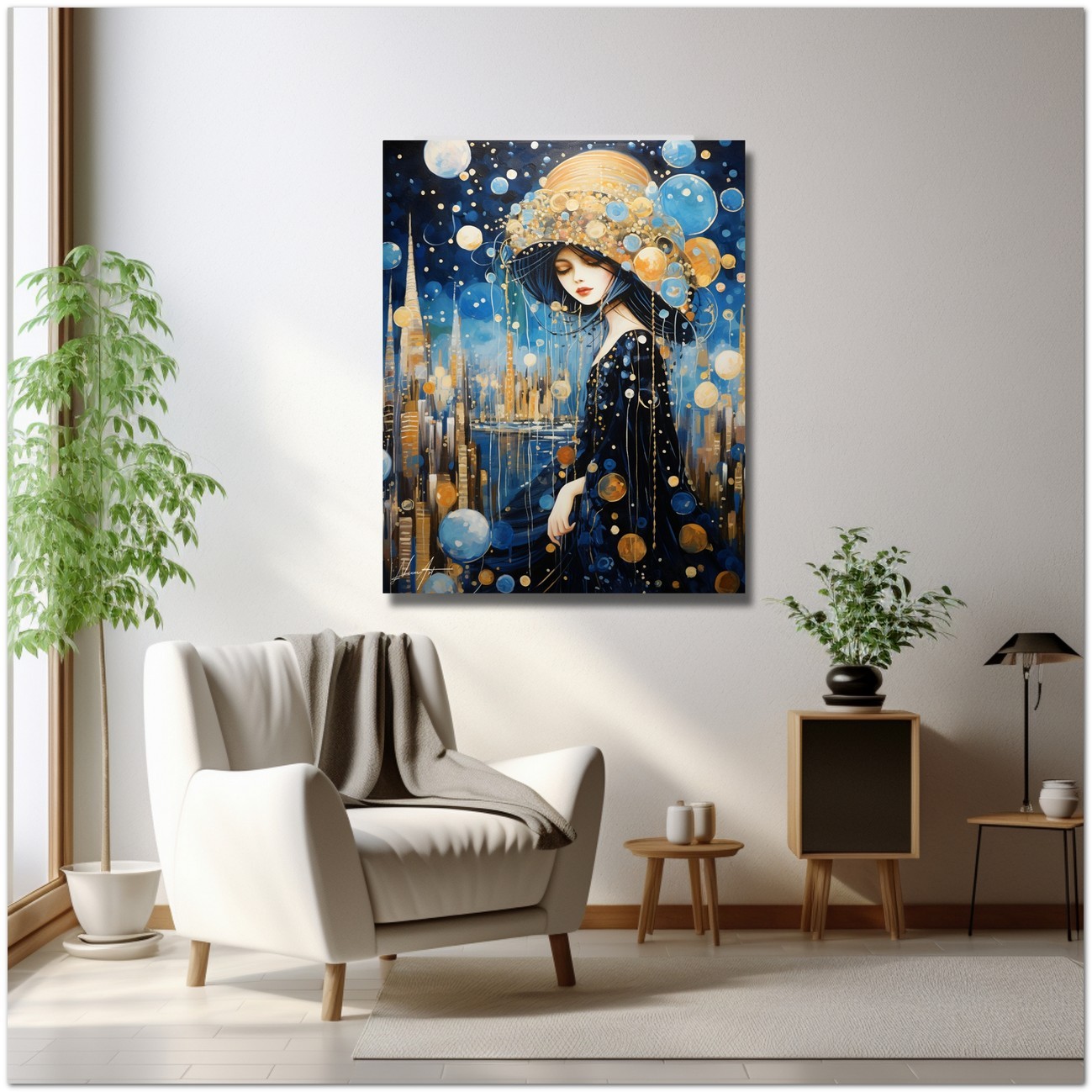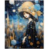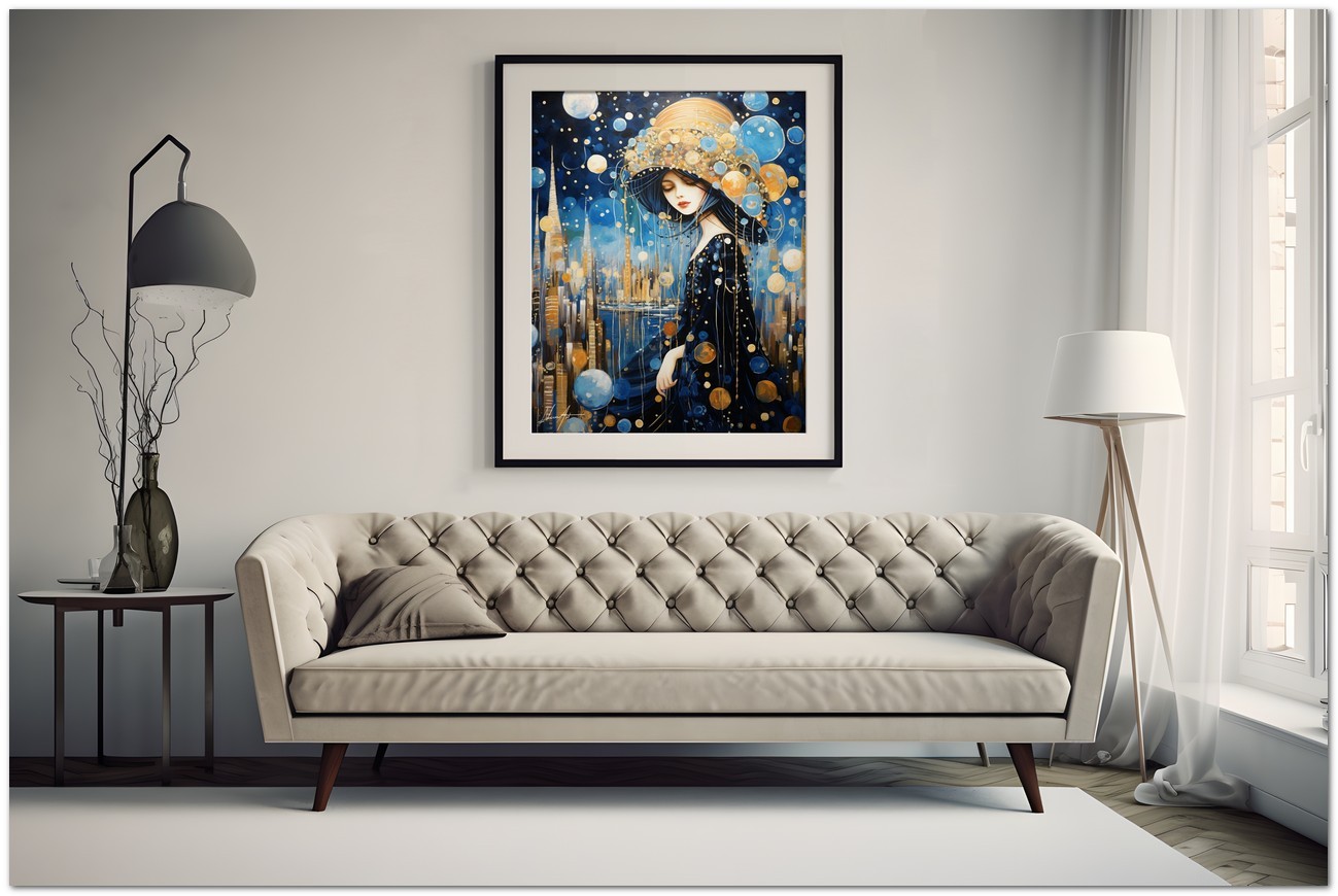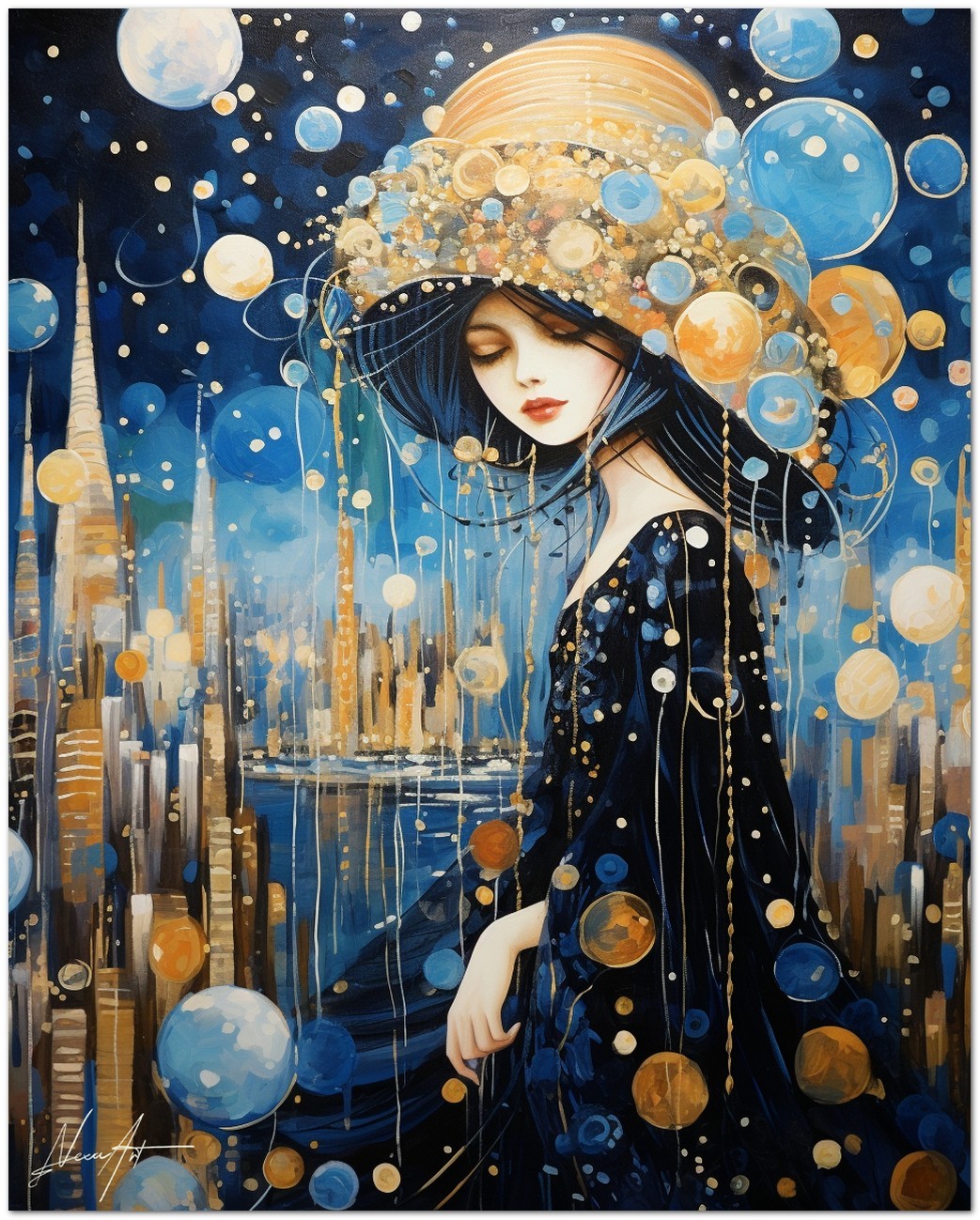 Diese digitale Kreation zeigt eine weibliche Figur, gehüllt in ein elegantes Nachthemd, geschmückt mit einem Kopfschmuck, der wie ein Mikrokosmos aus Sternen und Planeten aussieht. Das Gemälde kombiniert Elemente des Surrealismus und des Jugendstils mit schwebenden Kugeln, die an einen von Himmelskörpern belebten Nachthimmel erinnern. Authentizität und Einzigartigkeit