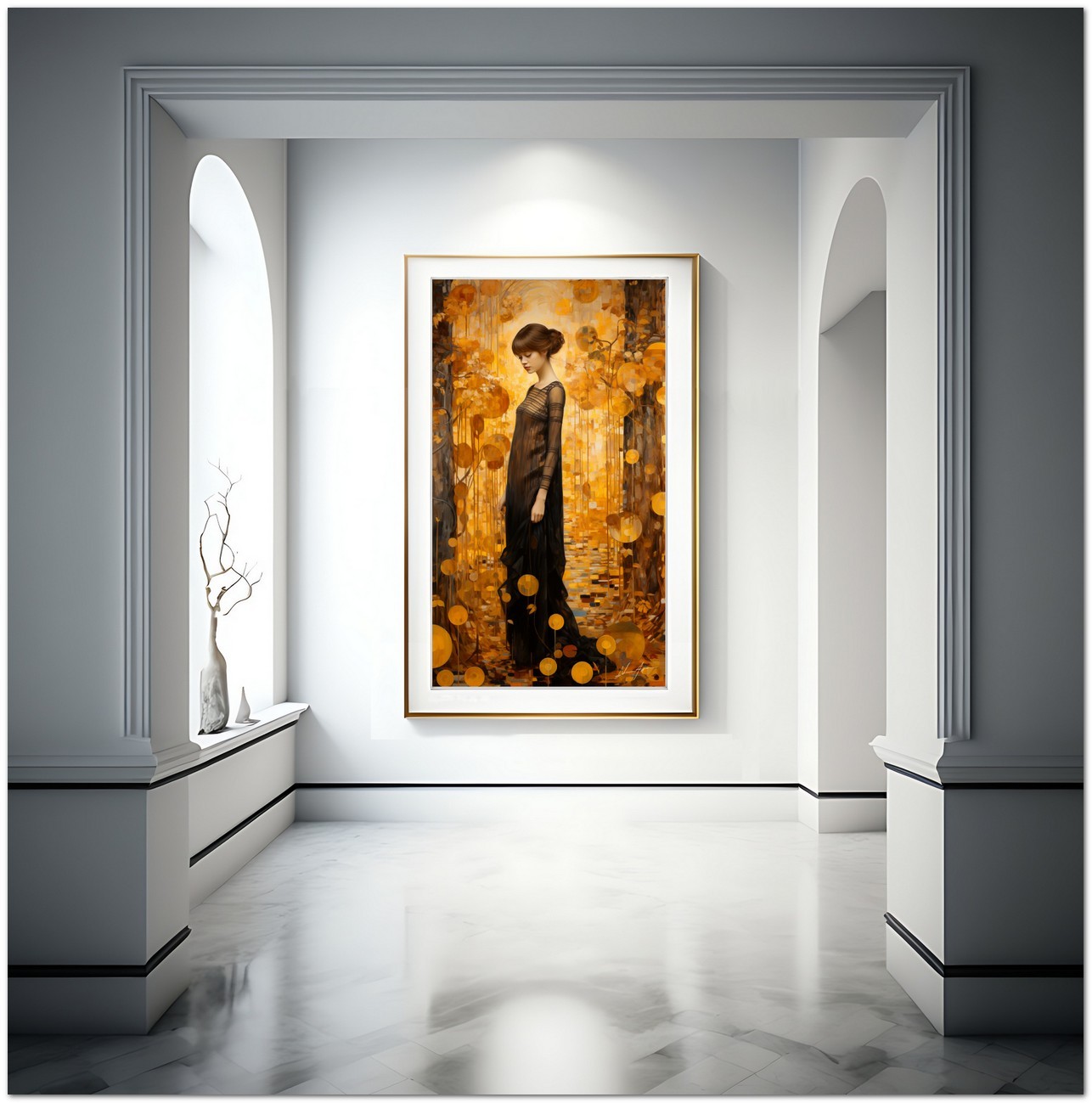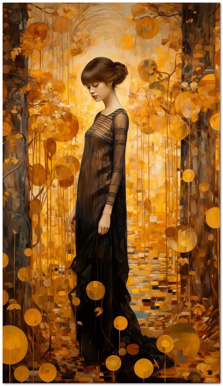 „The Reflexive Lady“ ist ein digitaler künstlerischer Ausdruck, der eine vielseitige und faszinierende Komposition einfängt. Im Mittelpunkt des Werks steht das Porträt einer Frau in einem goldenen Kleid, das Eleganz und Schönheit ausstrahlt und mit warmen Farbtönen verziert ist, die ihre Figur betonen. Das Werk verbindet gekonnt Elemente des Realismus, die sich in den präzisen Details des Porträts zeigen, mit Zügen des Abstraktionismus, die in der Komposition leuchtender Formen und Farben zum Ausdruck kommen. Details zum Werk „The Reflective Lady“: Klassifizierung, Techniken und Stile
