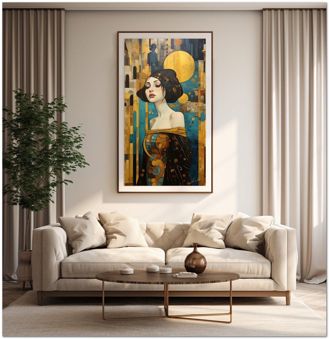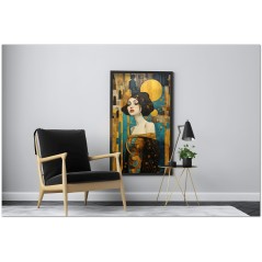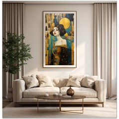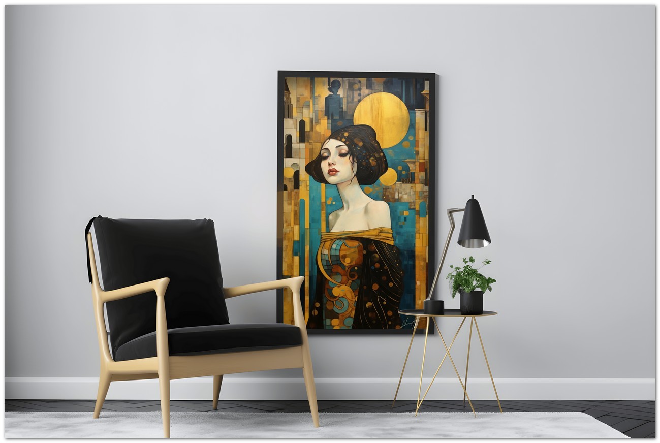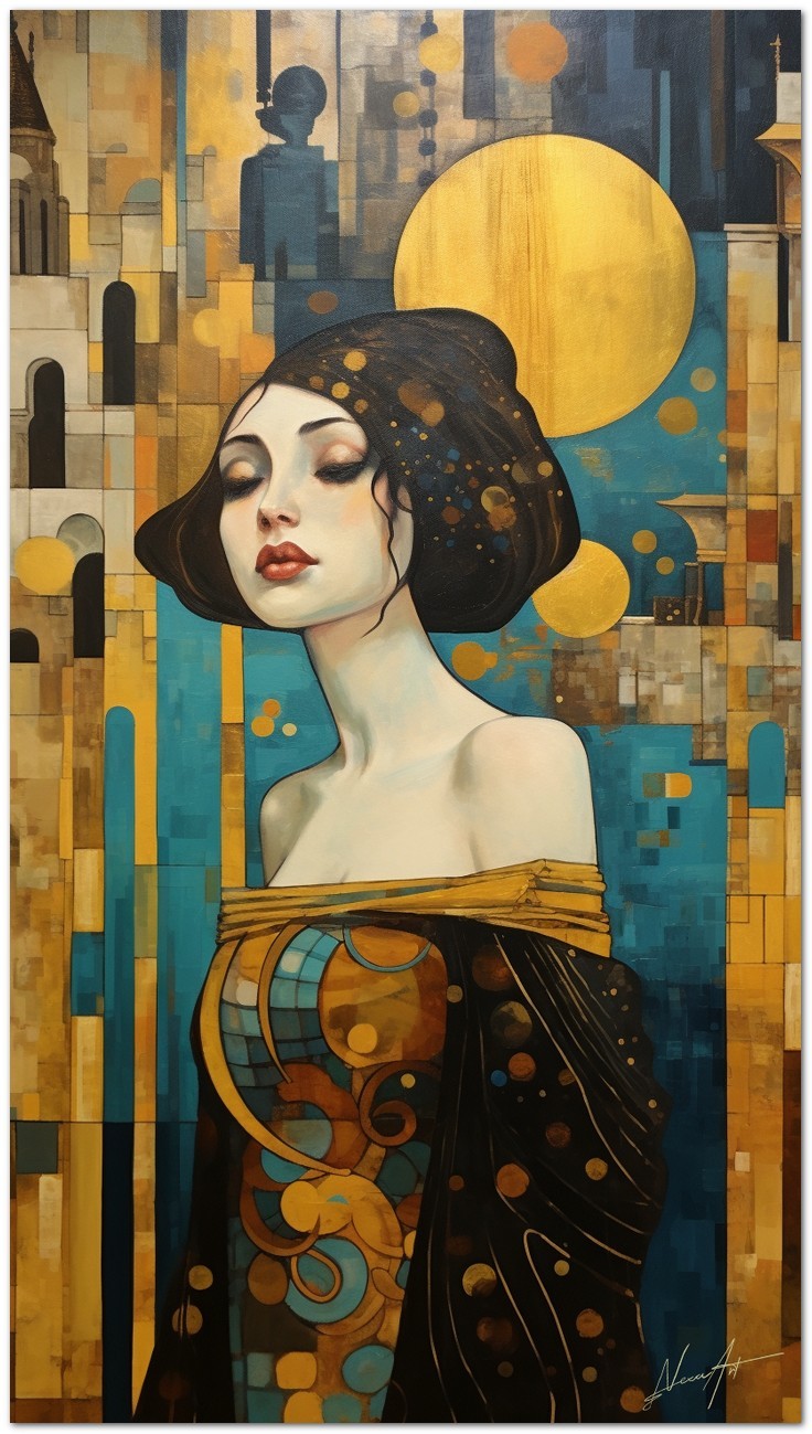 „Al Cospetto della Luna“ ist ein digitales Werk, das durch seine vielseitige und faszinierende Komposition verzaubert. Im Zentrum finden wir das Porträt einer Frau in einem goldenen Kleid, ein Element, das Eleganz und Schönheit ausstrahlt. Die Frau wird aus verschiedenen Perspektiven dargestellt, wobei besonderes Augenmerk auf ihr Kleid und die Farbvielfalt gelegt wird, die es auszeichnet. Im Hintergrund beherbergt ein kontrastierender blauer Himmel einen gelben Mond und einen abstrakten orangefarbenen Kreis, Elemente, die dem Ensemble Tiefe und visuelles Interesse verleihen. Details zum Werk „In the present of the Moon“: Klassifizierung, Techniken und Stile