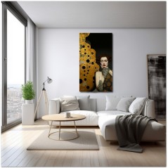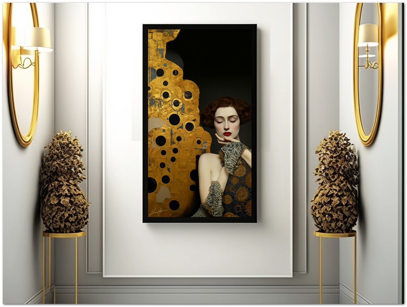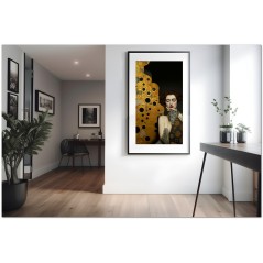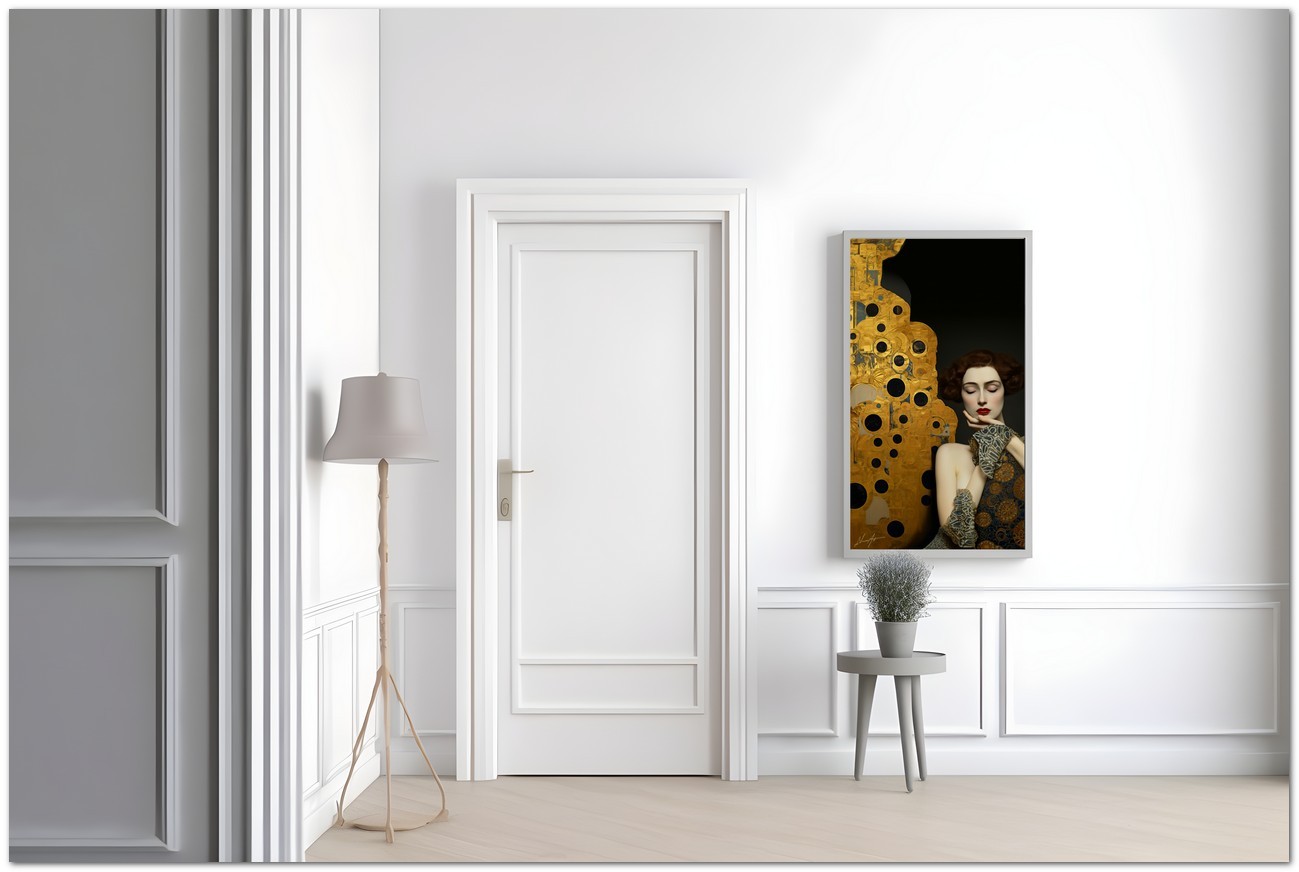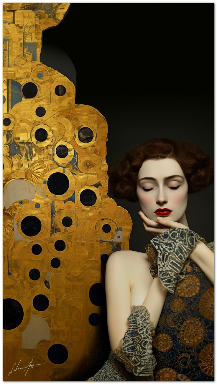 „Model Posing“ ist ein digitales Kunstwerk, das die Harmonie zwischen Realismus und Abstraktion erforscht. Eine mit Goldjuwelen geschmückte Frau nimmt anmutig die rechte Seite des Werks ein und spiegelt ein bewusstes und gelassen elegantes Bild wider. Trotz ihrer markanten Figur gibt ihr das Werk nur die Hälfte des Raumes und lenkt den Blick auf ein abstraktes, goldenes Element auf der linken Seite. Diese Komposition schafft einen faszinierenden Kontrast zwischen der menschlichen Figur und der Abstraktion, spiegelt die Spannung zwischen der greifbaren Eleganz der Frau und dem unerforschten Geheimnis des abstrakten Elements wider und lädt den Betrachter ein, über das Gleichgewicht zwischen Essenz und Form nachzudenken. Details zur Arbeit „Model in Posing“: Einordnung, Techniken und Stile
