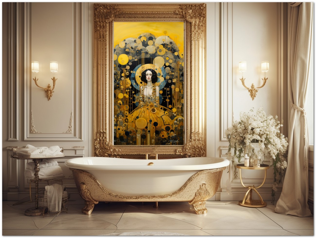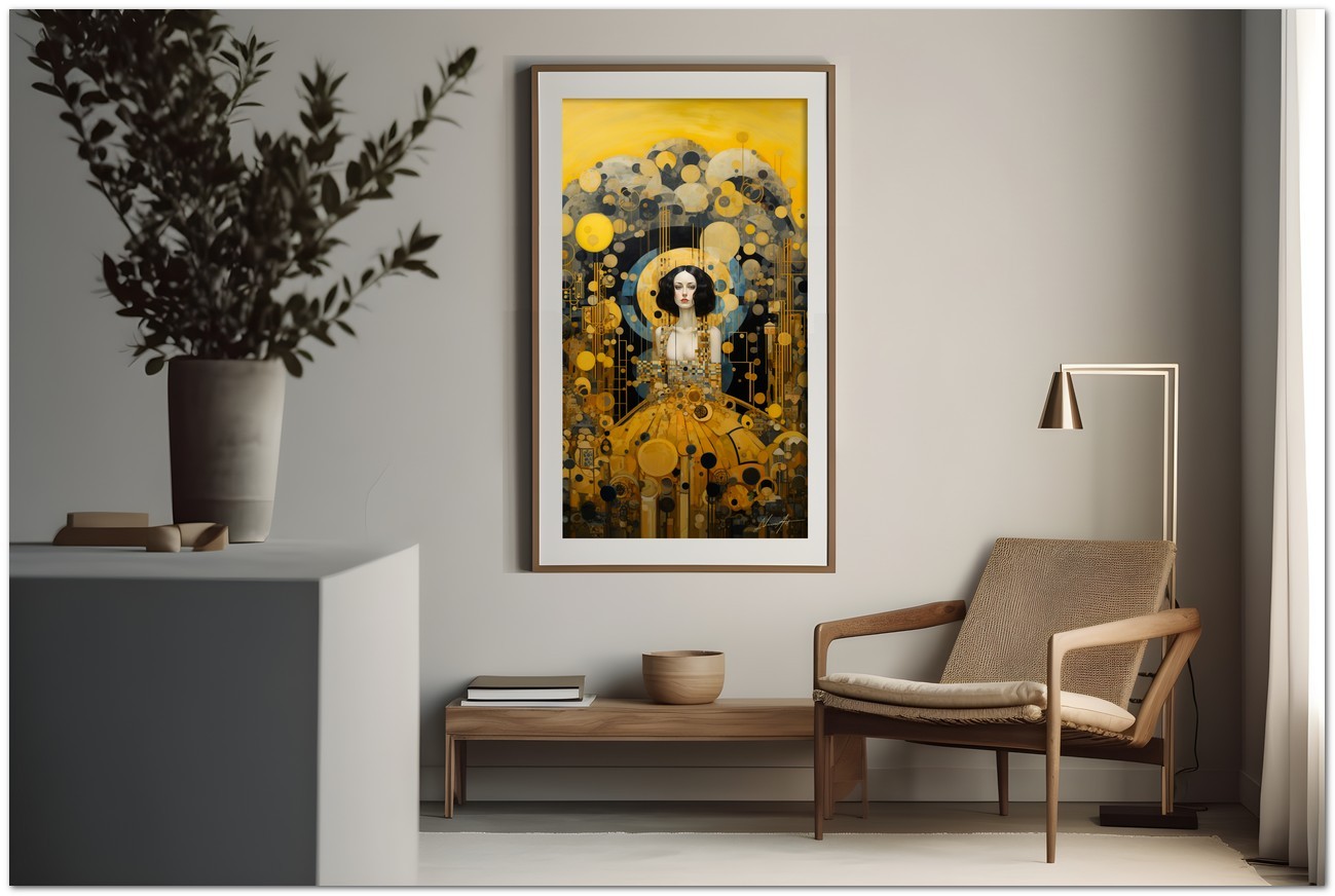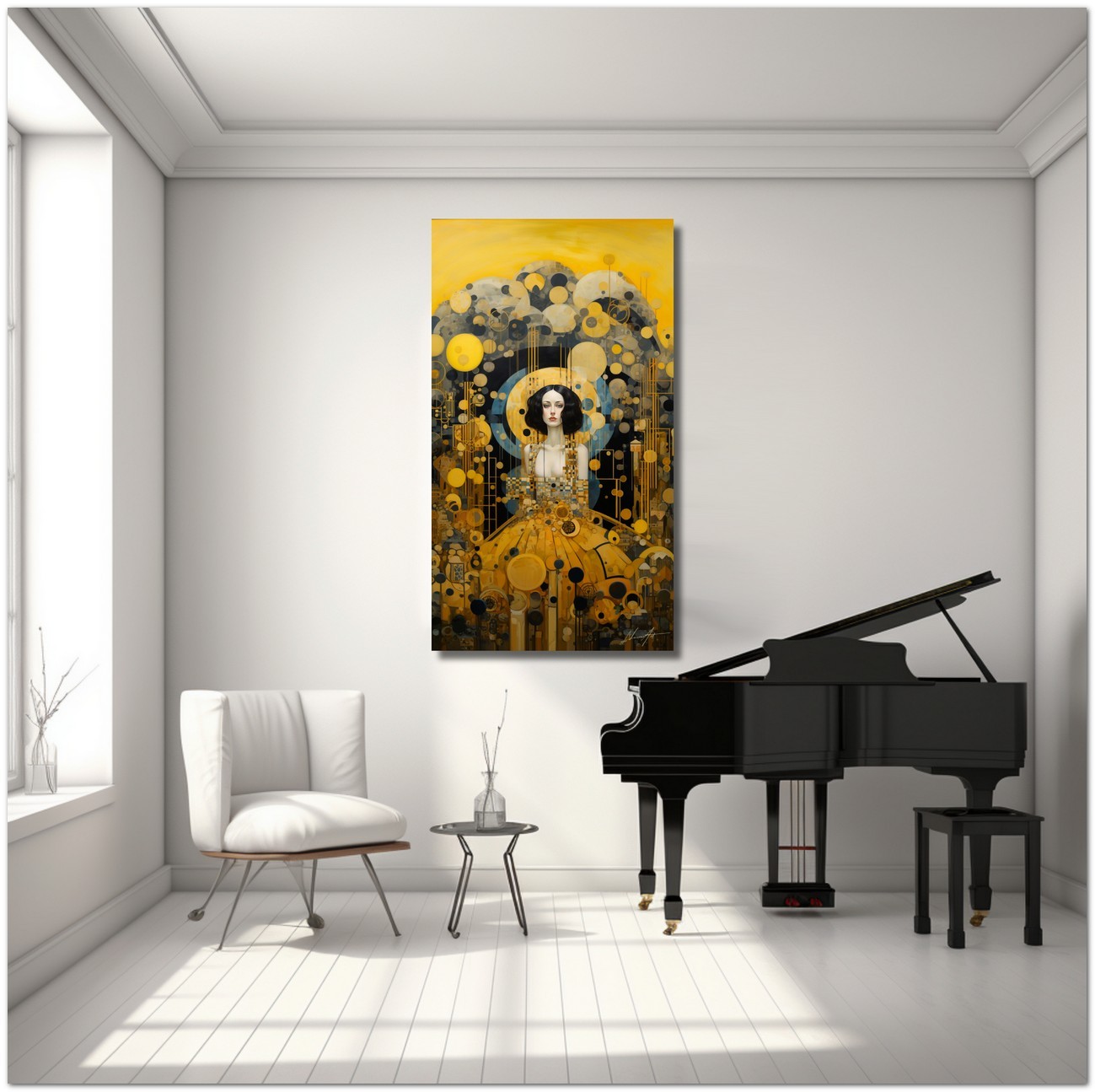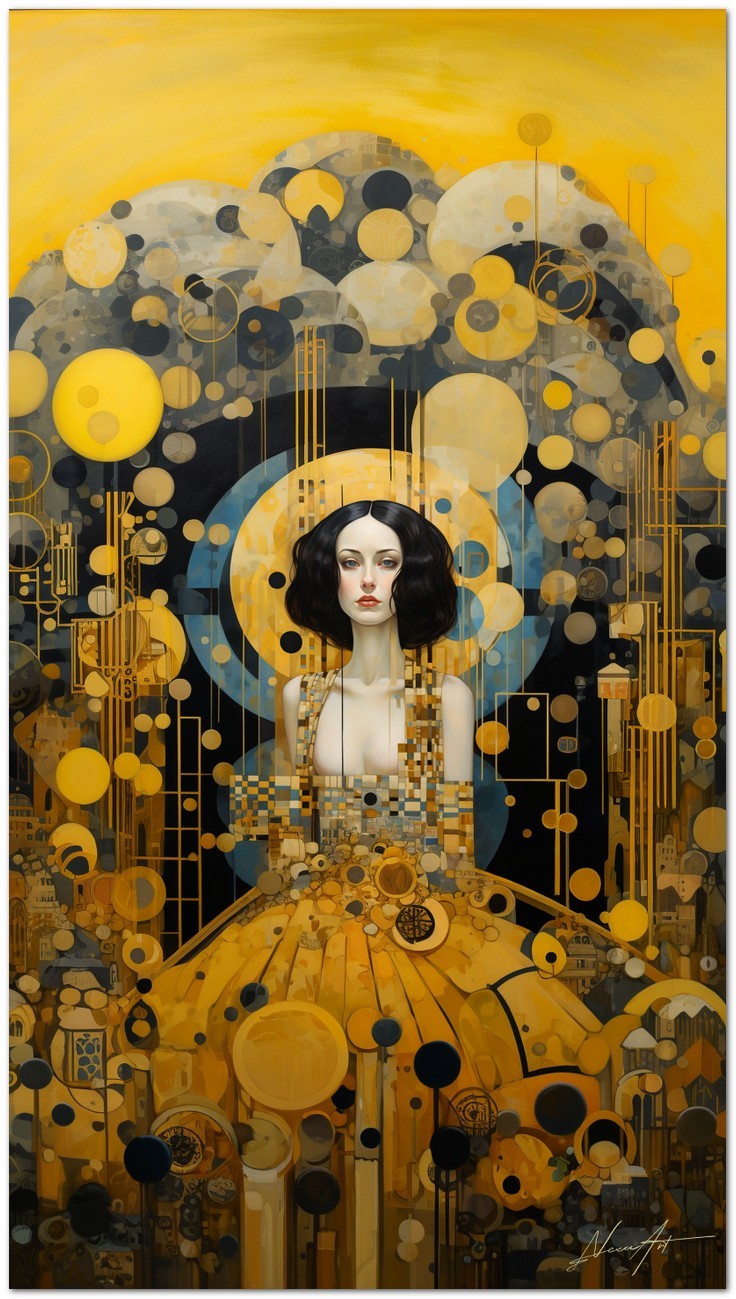 „Harmony of Yellow“ ist eine digitale künstlerische Darstellung, die Eleganz und Lebendigkeit einfängt. Im Zentrum des Werkes steht eine Frau in einem eleganten gelben Kleid, mit wallendem schwarzem Haar, das mit verspielten Tupfen verziert ist, die mit dem Hintergrund aus gelben und schwarzen Kugeln harmonieren. Das Ganze schafft eine energetische und kosmische Atmosphäre, die ein Gefühl von Bewegung und Lebendigkeit hervorruft. Details zum Werk „Harmonia di Giallo“: Klassifizierung, Techniken und Stile