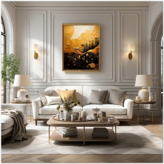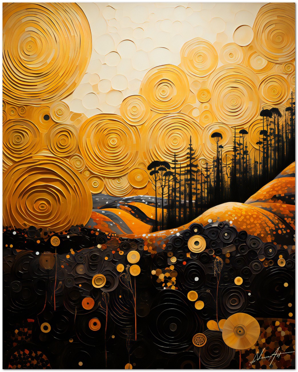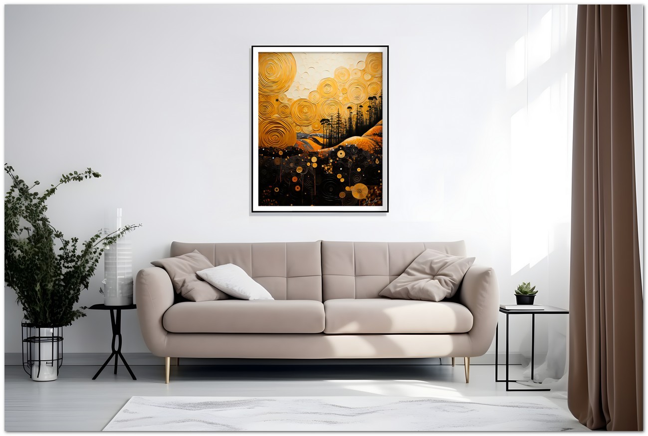 "Sguardo a Colori" is a digital work that drags the observer into an abstract and enigmatic world. The composition is characterized by an interesting combination of bright colors and swirling patterns. Dominated by shades of black, orange and yellow, the work creates a fascinating contrast. A large yellow circular shape stands out in the center, surrounded by a tangle of energetic lines and spirals, which give dynamism and movement to the whole. Details of the work 'Sguardo a Colori': Classification, Techniques and Styles