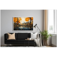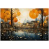 The painting depicts a landscape that combines elements of a quiet village with a bustling city. At the center, a village is surrounded by lush trees and crossed by a river, evoking a feeling of serenity. The work can be associated with the Realism pictorial style, given the detailed and faithful representation of natural elements. About This Work: Classification, Techniques and Styles