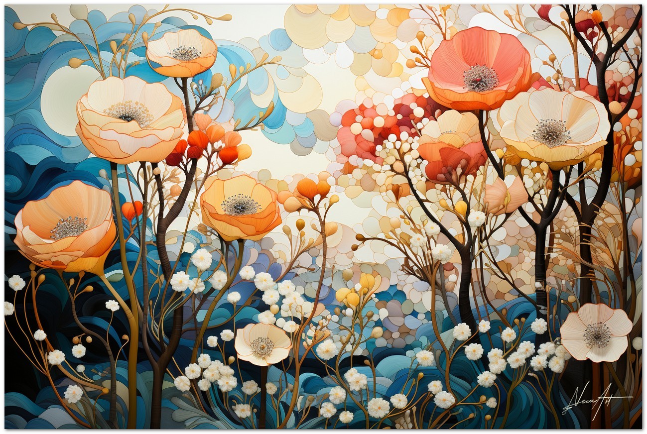 The work depicts an enchanted garden, in which every flower seems to whisper forgotten stories. The sinuous trees and clouds of petals create a dreamy atmosphere, where nature expresses itself in its maximum beauty and complexity. The work can be associated with the Realism pictorial style, given the detailed and faithful representation of natural elements. About This Work: Classification, Techniques and Styles