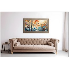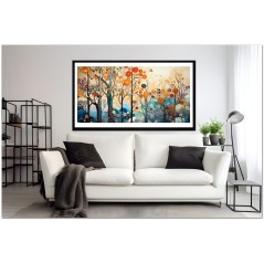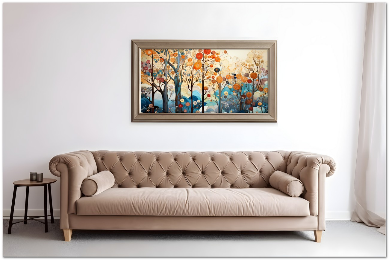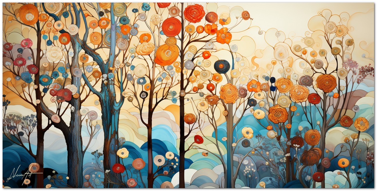 This unique digital work captures an enchanted landscape where majestic trees rise from the ground, their branches highlighted by intricate spirals and patterns. Each tree seems to sing with a variety of flowers and patterns reminiscent of visual music. The shades of blue and ocher create a contrast that balances the composition, evoking a feeling of serenity and wonder. The work can be associated with the Realism pictorial style, given the detailed and faithful representation of natural elements. About This Work: Classification, Techniques and Styles