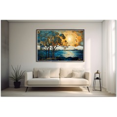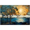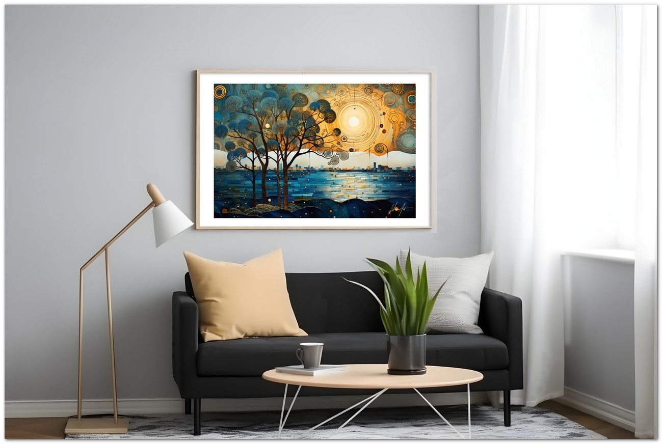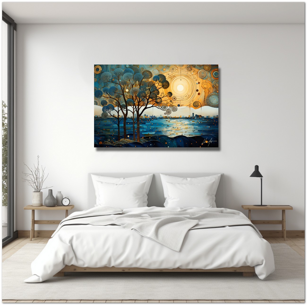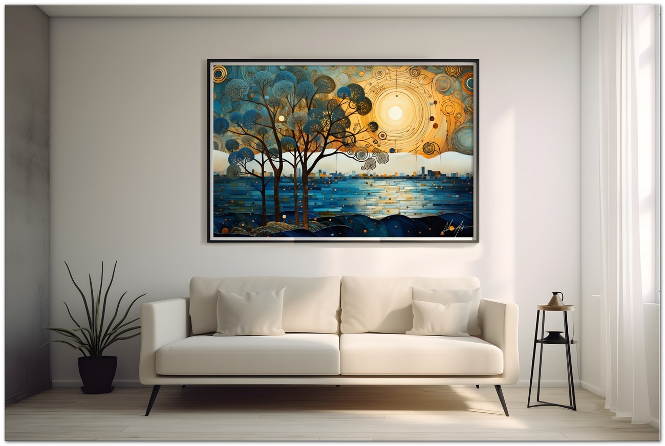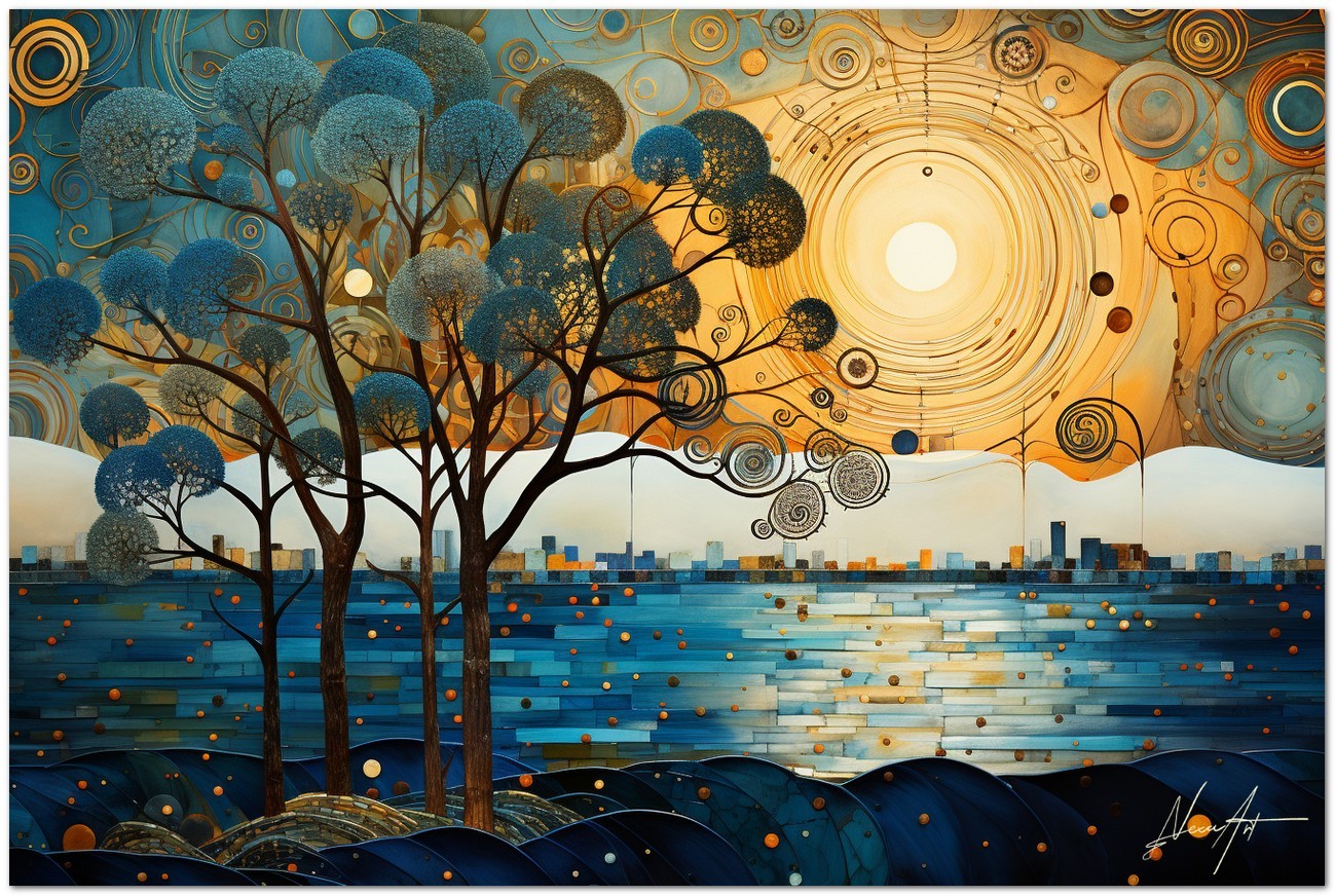 In this composition, leafy trees rise majestically in front of a distant metropolis, their silhouettes defining the horizon. The sky is dominated by a radiant sun surrounded by spiraling patterns and circles, evoking a sense of movement and energy. The surface in front of the trees features wavy layers, decorated with luminescent spheres, as if they represented the energy waves of the city itself. The work can be associated with the Realism pictorial style, given the detailed and faithful representation of natural elements. About This Work: Classification, Techniques and Styles