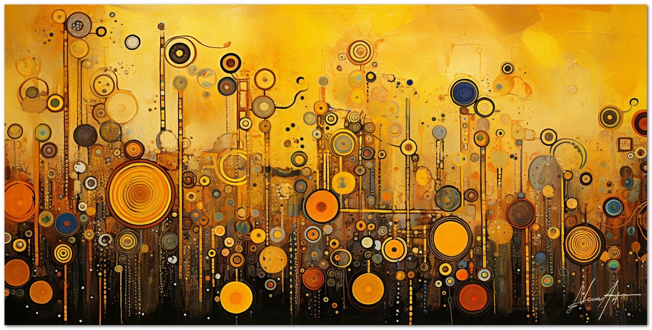The digital work Sussurri d'Oro explores the synergy between geometry and nature through a vortex of circles and spirals in a palette dominated by gold and enriched with touches of deep blue and vibrant orange. The shapes extend onto a background reminiscent of an abstract landscape, where each circular element could be interpreted as a celestial body or a cell under a microscope. Creative Process and Innovation