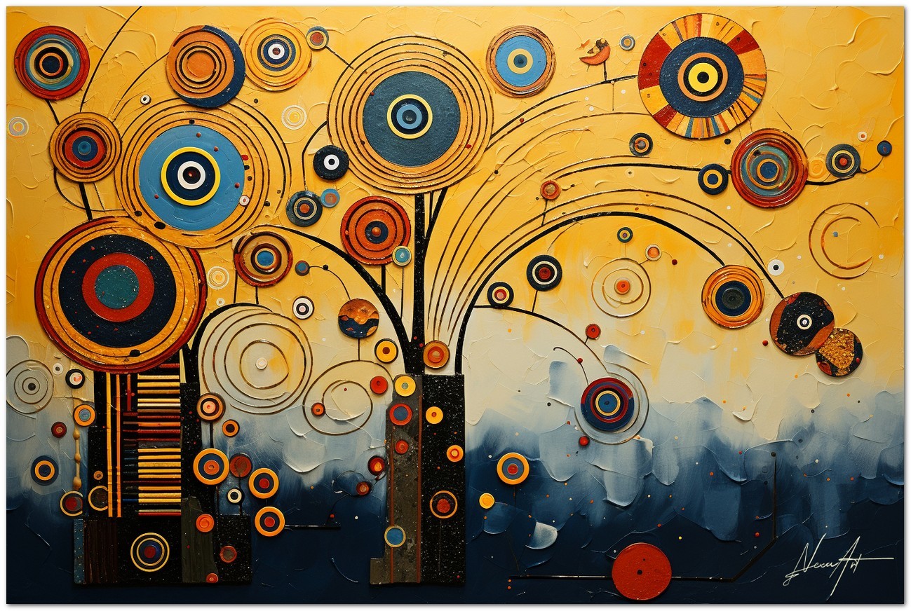 This work Awakening of Gaia represents an abstract sunrise, where the sunlight emerges vibrantly through geometric shapes that simulate a vivid and pulsating landscape. Warm tones of orange, yellow and red contrast with tranquil blue, suggesting the moment when night gives way to day. The work combines elements of expressionist abstractionism with touches of digital surrealism. Creative Process and Innovation