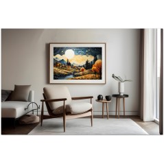 "Autumn Night" is a digital work that captures the enigmatic beauty of an autumn nocturnal landscape. The fusion between the darkness of the night and the warm colors of autumn creates an atmosphere of tranquility and mysticism. The shadows of the bare trees stand out against a starry sky, giving the work a feeling of peace and contemplation. The soft light of the stars delicately illuminates the scene, revealing the subtle details of nature and accentuating the silent enchantment of autumn.