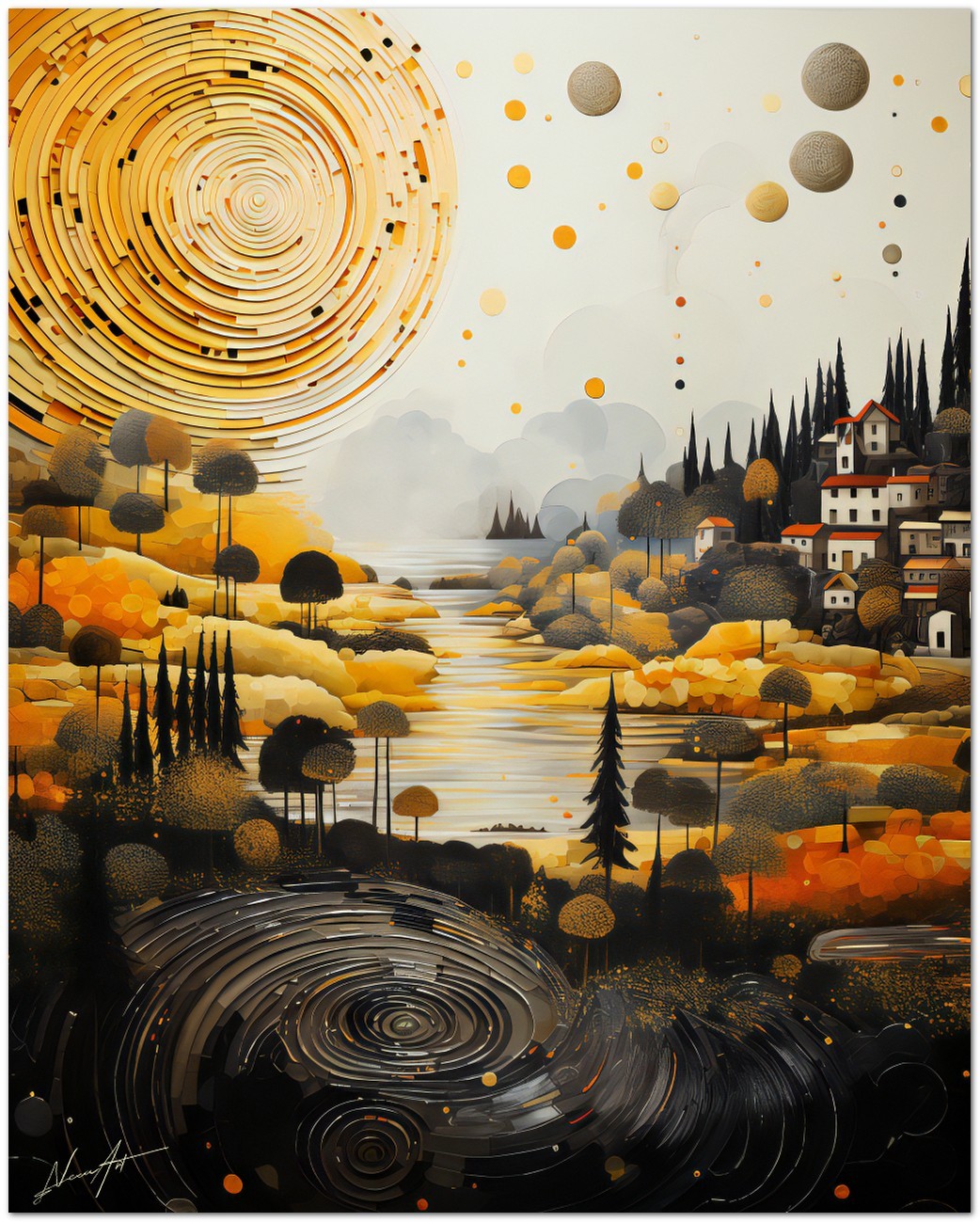 "The River and the Abyss" is a digital work that explores the contrast between the serenity of nature and the depth of abstraction. The scene is dominated by a tranquil landscape with lush trees and a sinuous river, symbols of harmony and peace. This tranquility, however, is in stark contrast with a black vortex that opens in the lower part of the work, symbolizing depth and mystery. Despite the diversity of these elements, they coexist in a visually fascinating balance. Characteristics of the work 'The River and the Abyss': Classification, Techniques and Styles