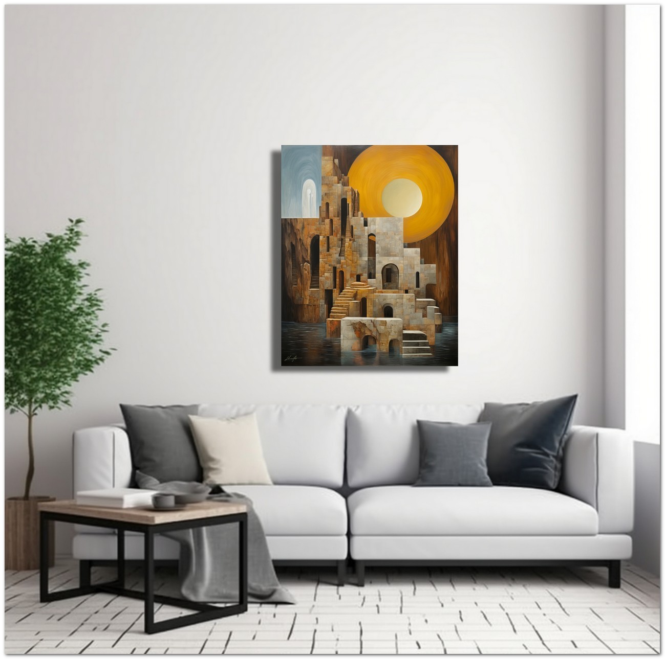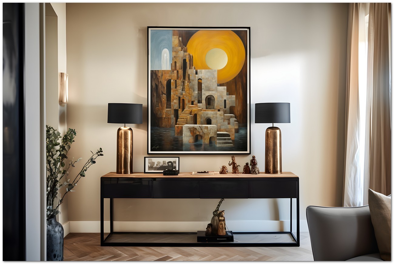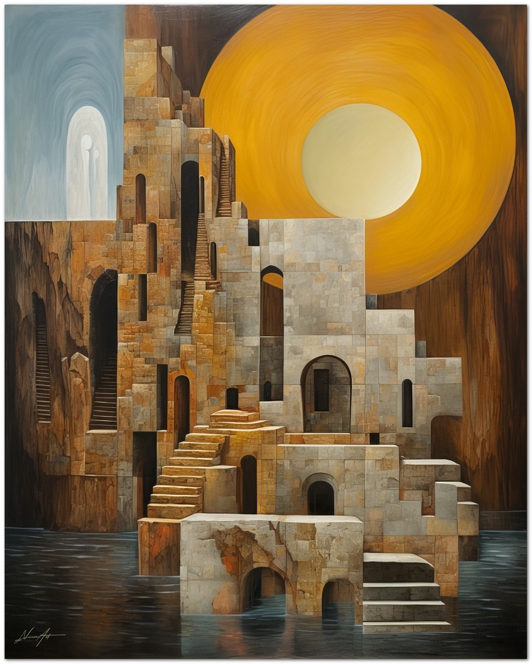 “Secret Ruins” is a digital painting that evokes a sense of history and mystery. In the center, an imposing stone building stands with a grand arched entrance, surrounded by steps that invite discovery. The work is immersed in a surreal atmosphere, with a vibrant yellow sun that illuminates the scene, creating suggestive shadows. Water flowing through the structure adds a dynamic and calming element, while a wooden structure emerging from the water provides an interesting contrast to the solidity of the stone. Details of the Work 'Secret Ruins': Classification, Techniques and Styles