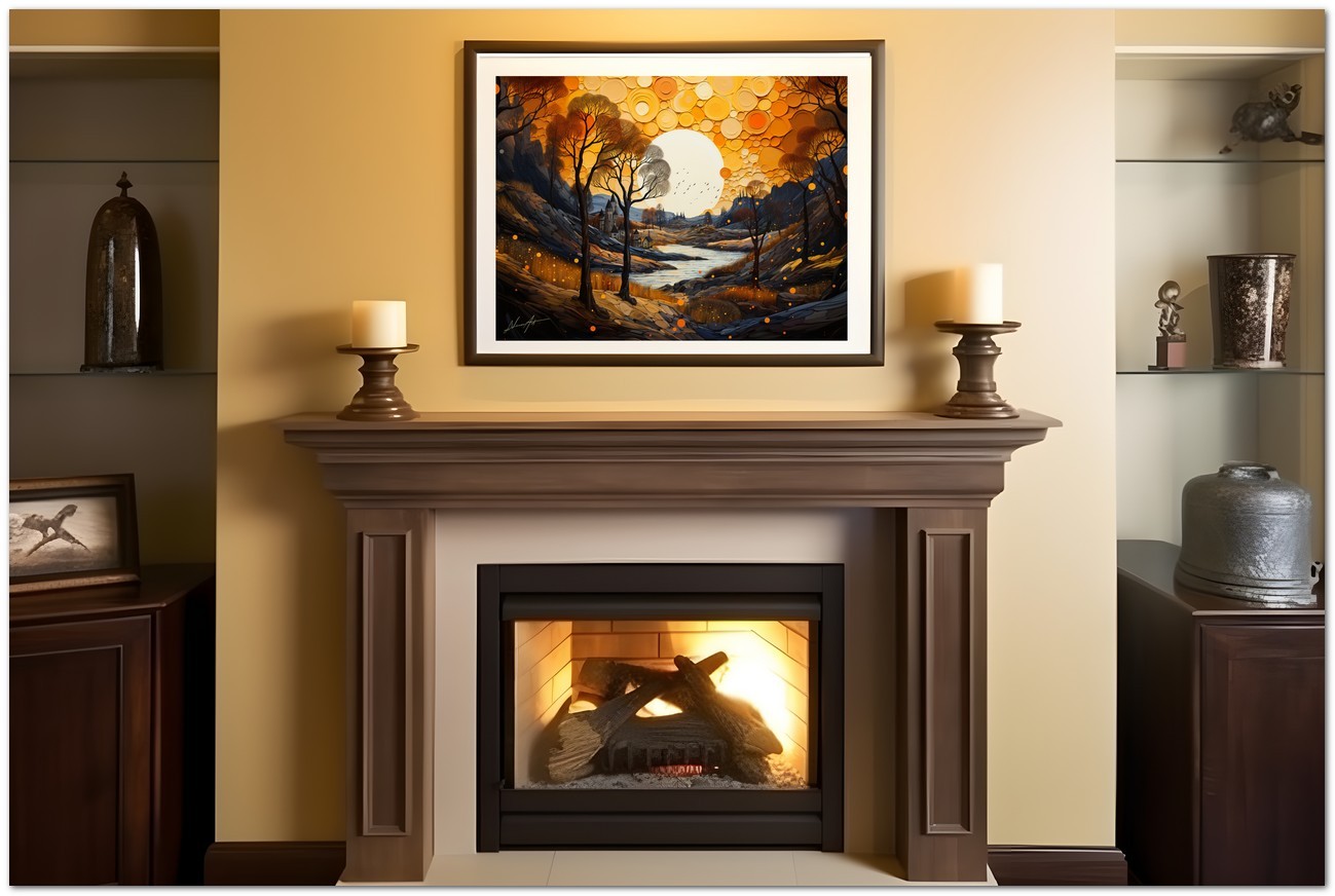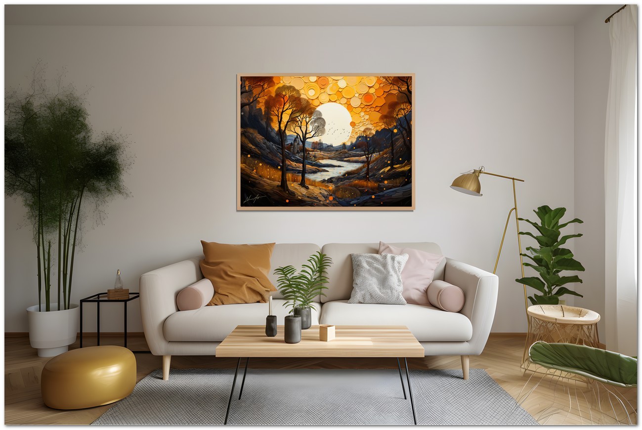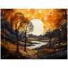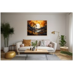 "Autumn Reflections" is a digital work that paints a breathtaking autumn landscape. Dominated by majestic trees in shades of red, orange and yellow, the painting stands out against a clear blue sky. A meandering river crosses the scene, giving depth and movement, while in the centre, a full moon illuminates the landscape with its silvery light, creating an atmosphere of serenity and charm. Details of the work 'Autumn Reflections': Classification, Techniques and Styles