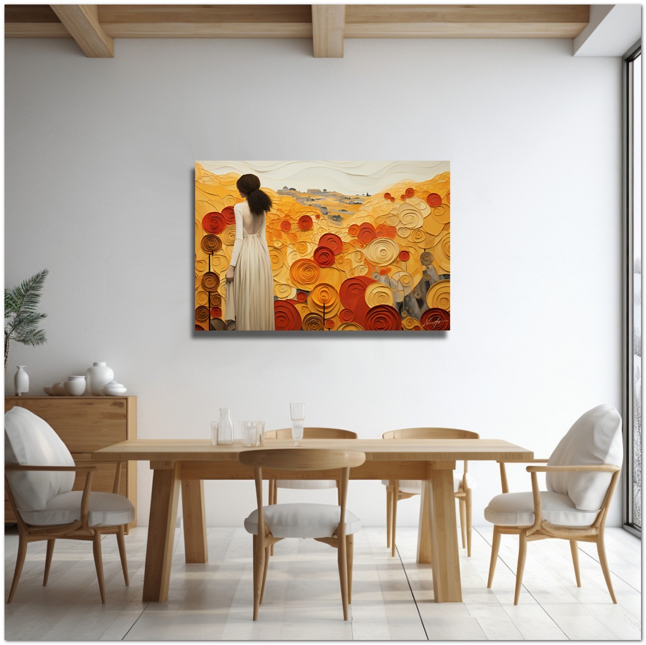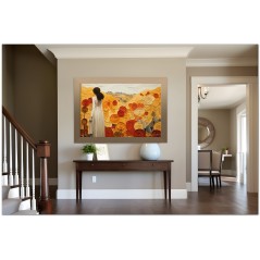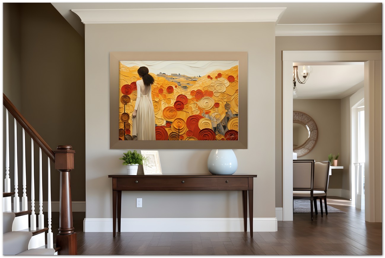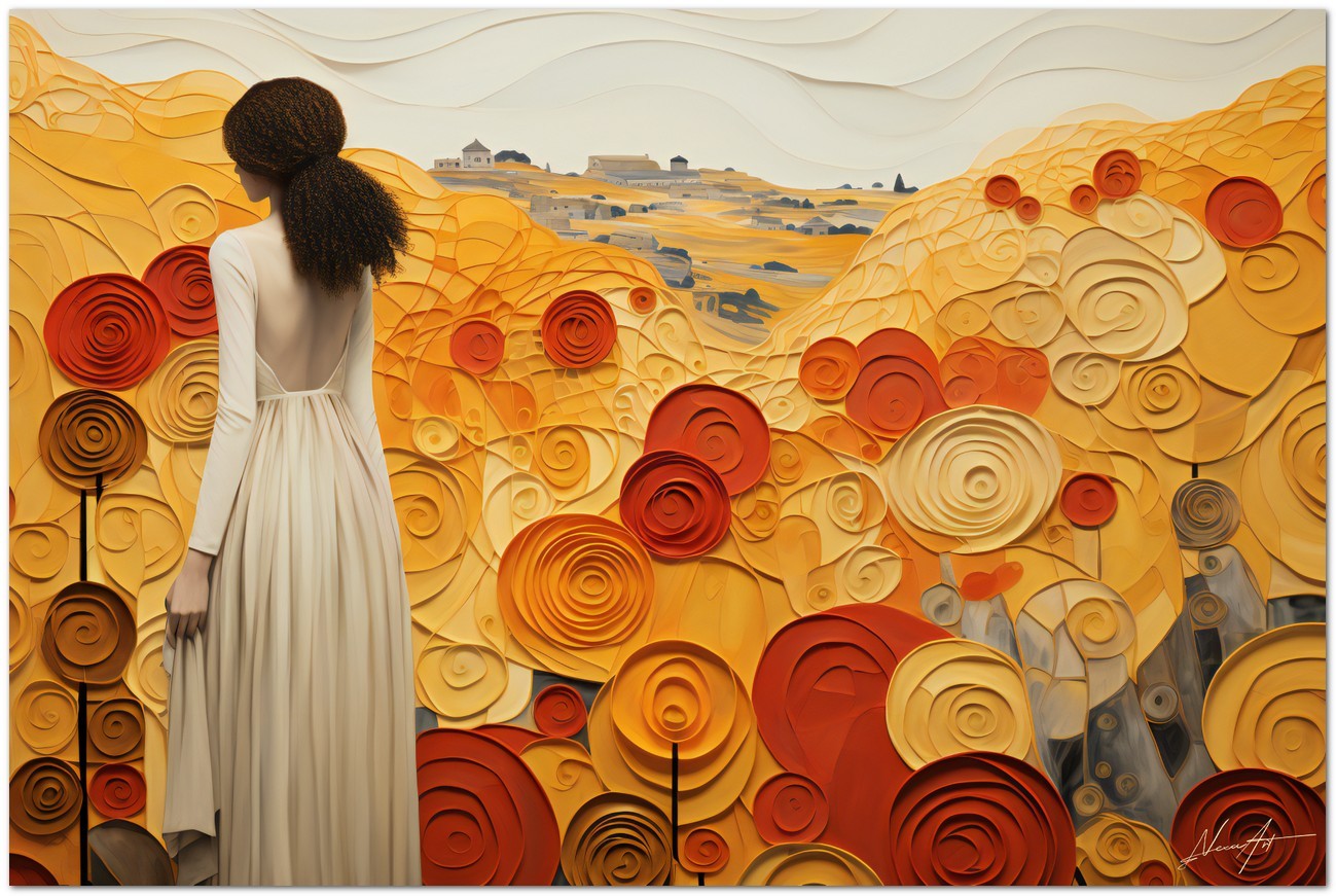 “The Lady among the Flowers” is a digital artistic expression that captures a serene and harmonious scene. At the center of the work, a woman in an elegant white dress stands amidst a picturesque meadow filled with vibrant flowers. Her curly hair frames her face, expressing a natural and spontaneous beauty, while the fusion of realism and abstraction paints a peaceful and evocative scene. Details of the work 'The Lady among the Flowers': Classification, Techniques and Styles