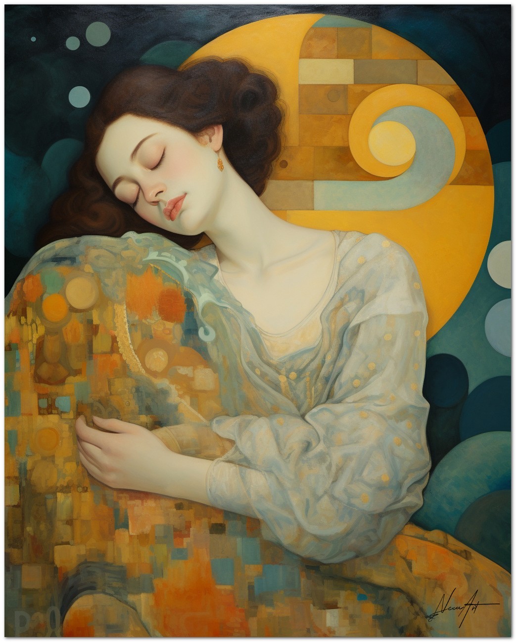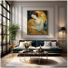 In this mesmerizing work of art, a multitude of symbolic elements come together to create a hypnotic composition. The central focus is a peacefully sleeping woman with her eyes closed. The artist has expertly captured the serene expression on her face, accentuating her tranquility and inner peace. The work can be associated with the Realism pictorial style, given the detailed and faithful representation of natural elements. About This Work: Classification, Techniques and Styles