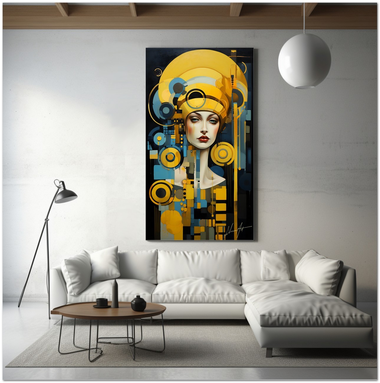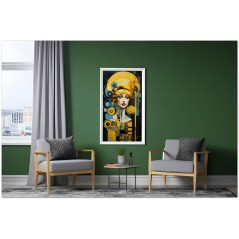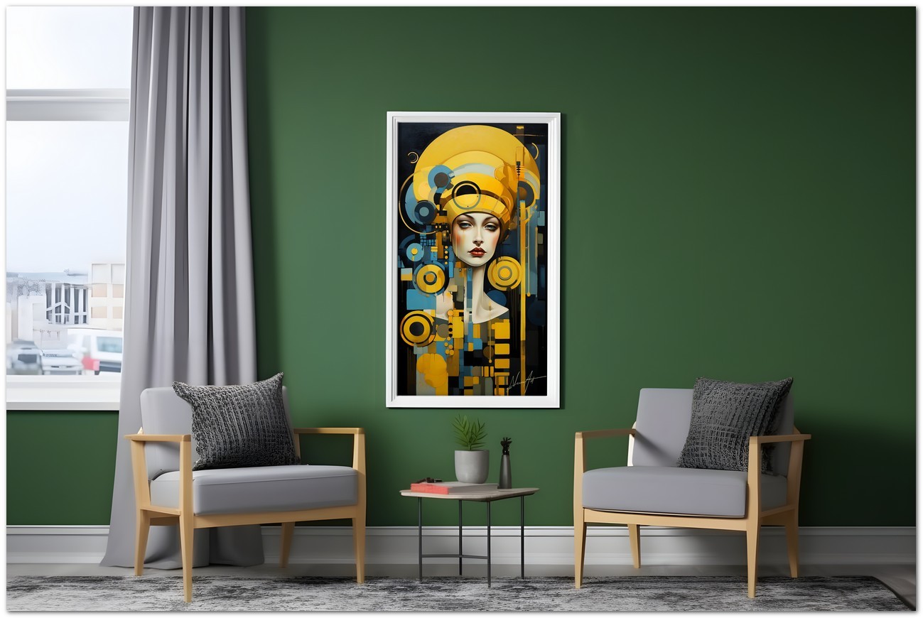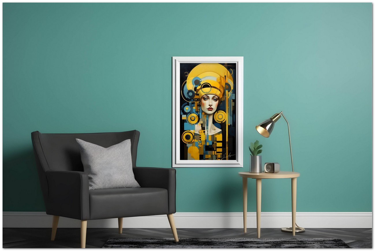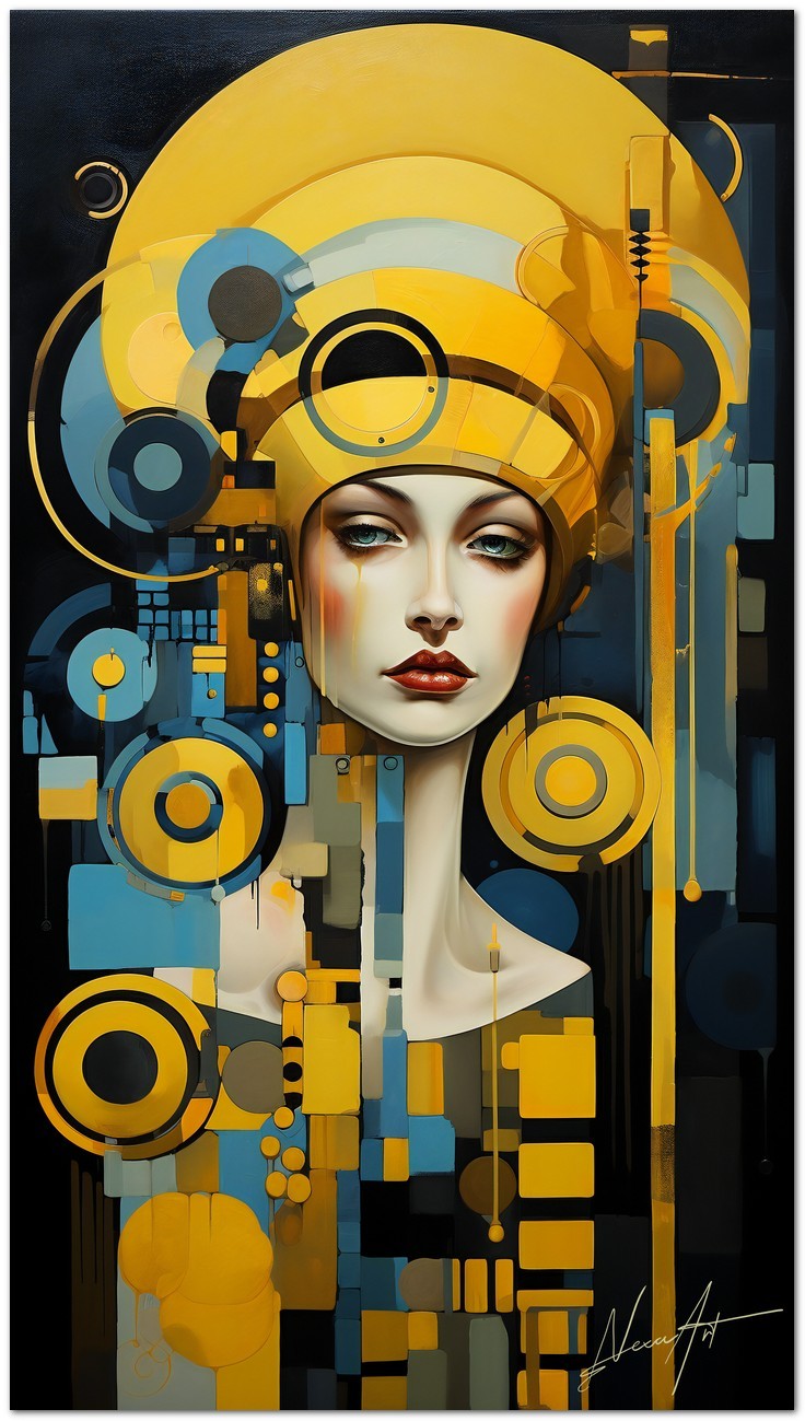"Sguardi e Geometrie" is a digital work that portrays a fascinating portrait of a woman with a yellow hat. Attention is focused on his eyes, which are depicted in a close-up manner to underline their penetrating gaze. The composition is enriched with geometric elements, including yellow and black circles, which create a vivid visual contrast and add a dimension of depth to the image. Artistic Innovation