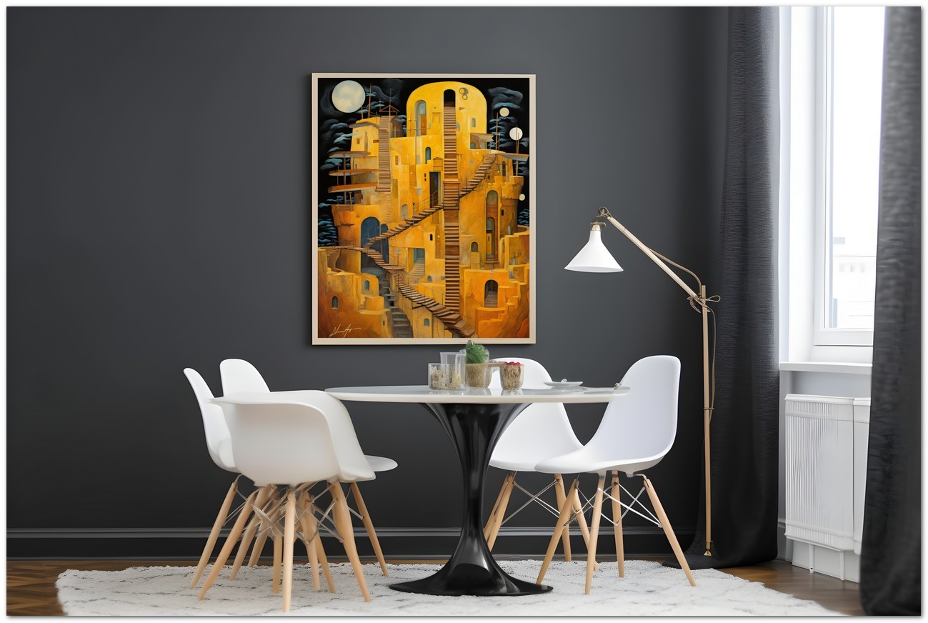 Dimensions : Chaque œuvre est imprimée dans un format unique, avec une largeur de 60, 80 ou 100 cm et une hauteur proportionnelle à l'image originale. La dimension spécifique est choisie en fonction de la composition de l'œuvre pour garantir le meilleur rendu visuel.