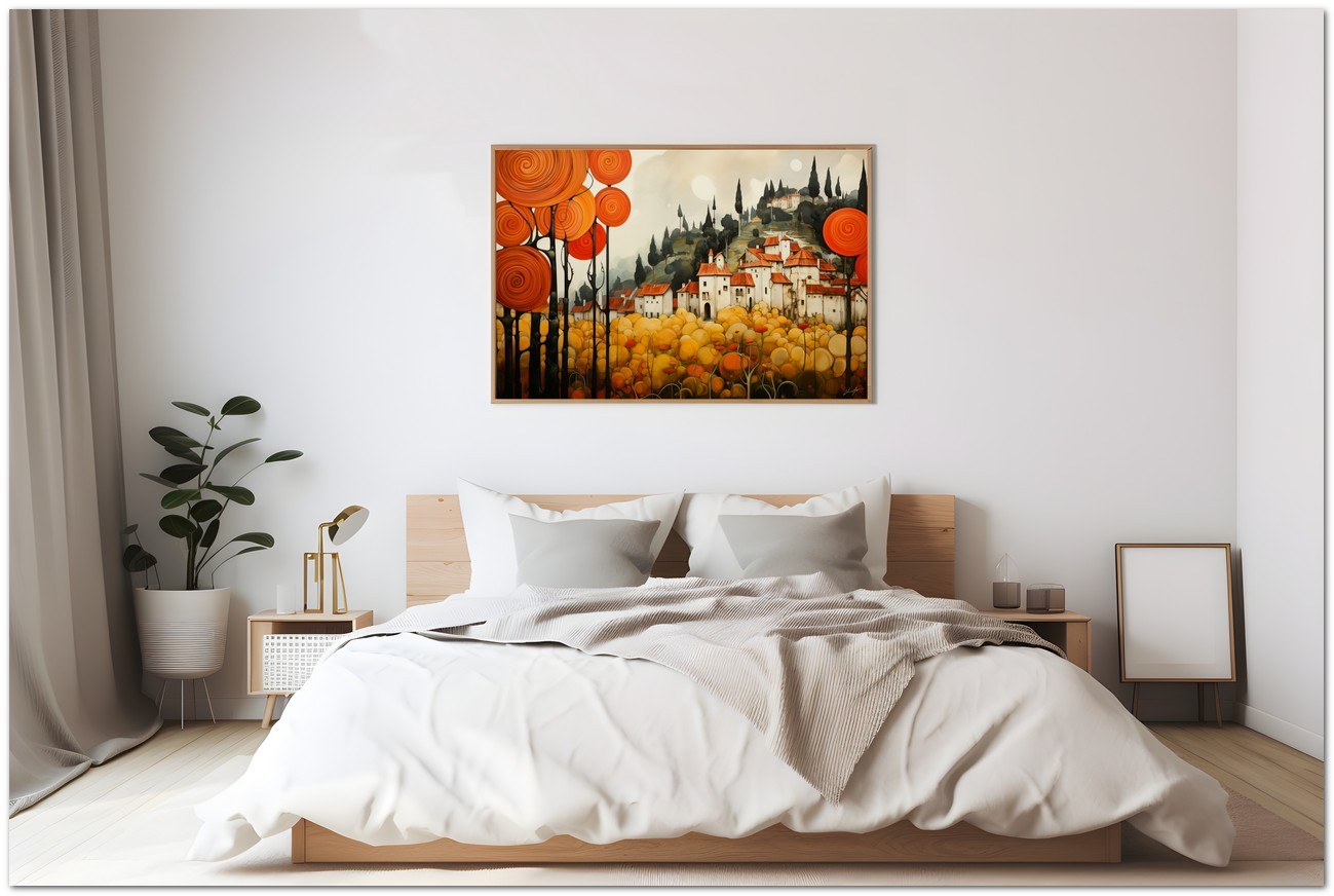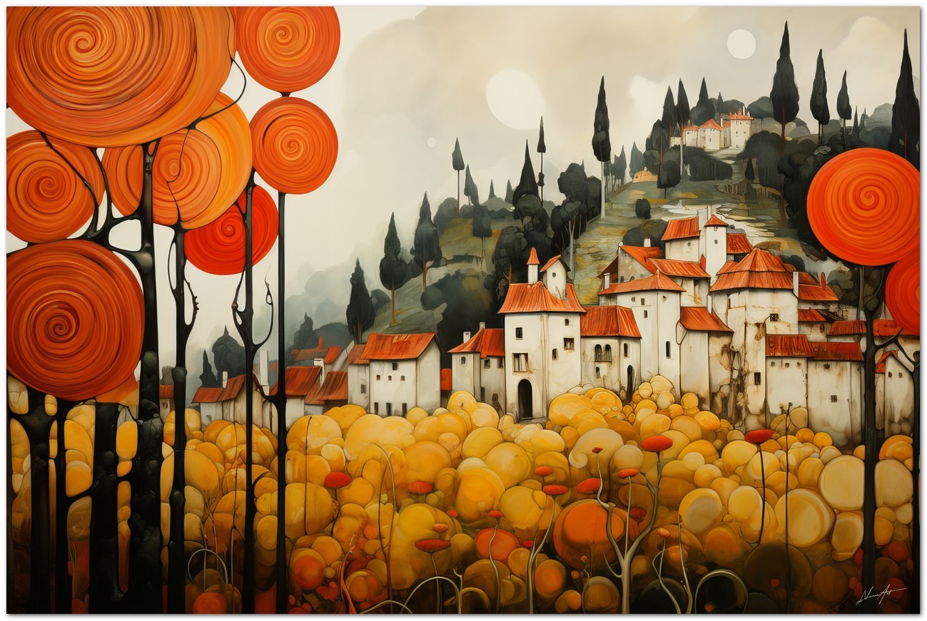 « Village Among the Poppies » est une peinture numérique qui capture le charme d'un village pittoresque enveloppé dans une mer de coquelicots orange. Cette œuvre artistique se distingue par ses couleurs vives et l'atmosphère sereine qu'elle évoque. Le village, peint dans des tons chauds, émerge magnifiquement sur fond de collines et d’un ciel bleu cristallin. Les coquelicots, baignés de soleil, forment un tapis pittoresque qui embrasse délicatement le village, créant une image idyllique et paisible. Détails de l'œuvre 'Village parmi les coquelicots' : classification, techniques et styles