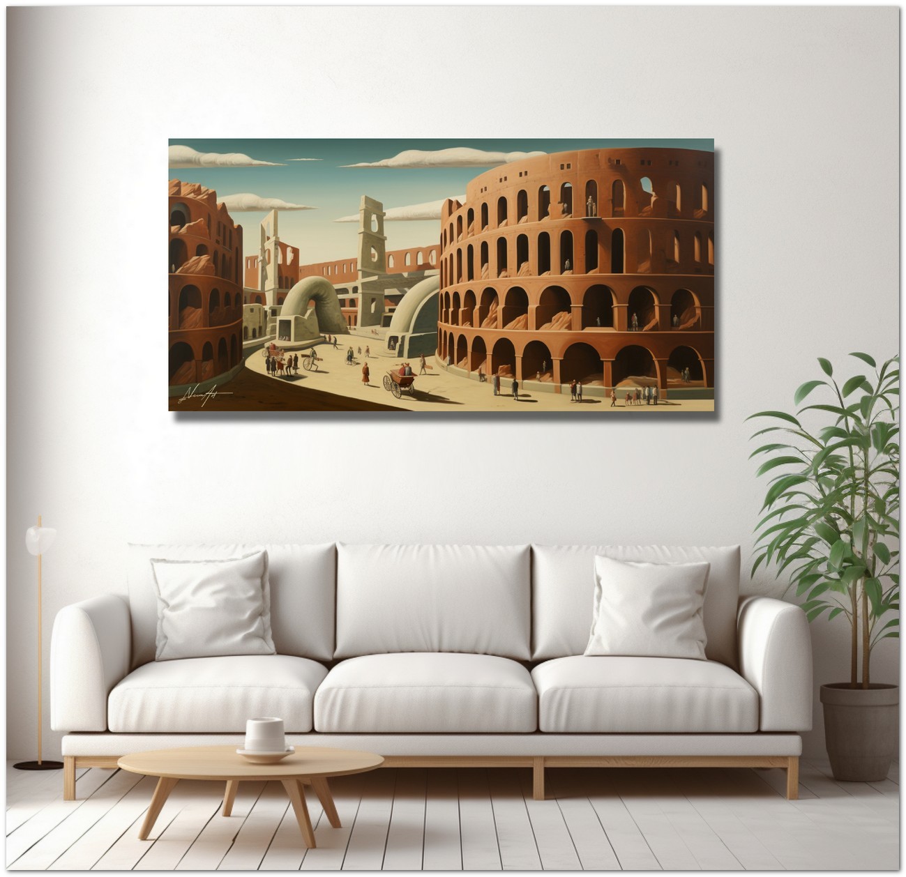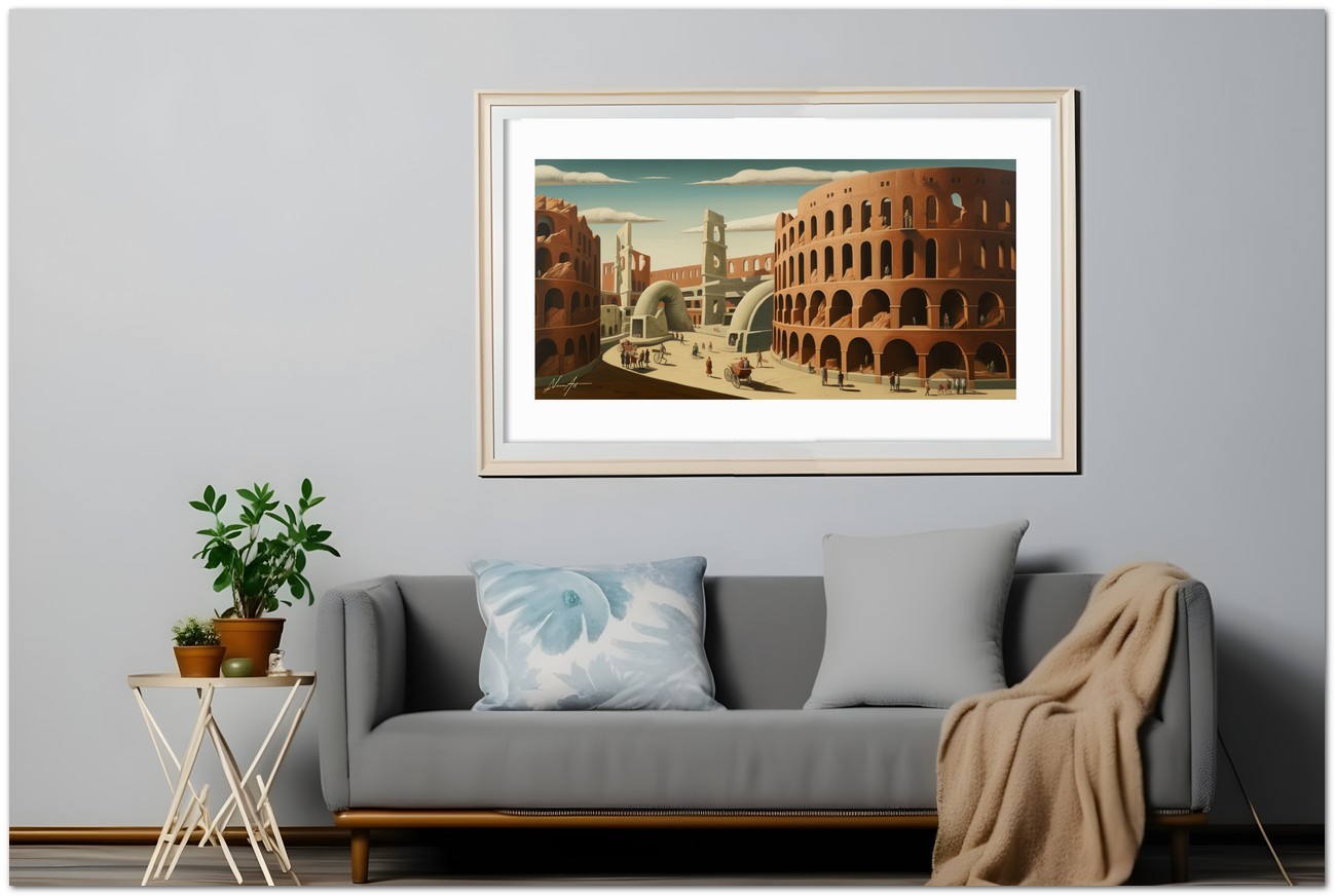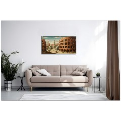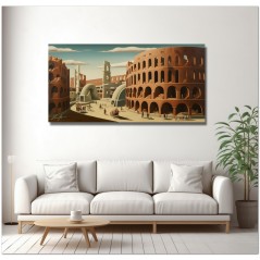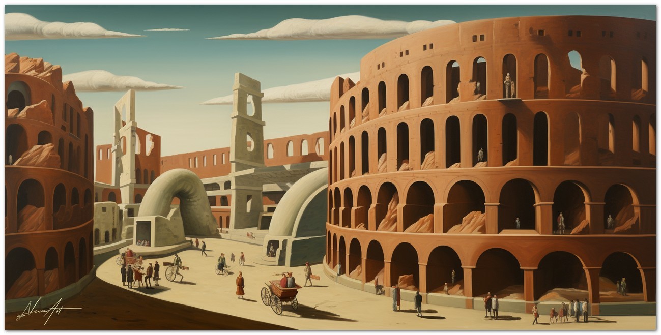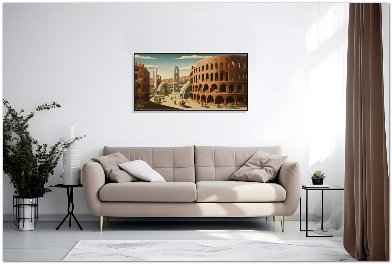 L'artiste a créé une peinture vibrante qui capture l'essence d'un paysage urbain effervescent. Au centre de la toile se dévoile une grande ville, remplie de bâtiments imposants et d'une multitude de gens vaquant à leurs activités quotidiennes. L'architecture rappelle l'emblématique Colisée de Rome, avec sa présence majestueuse dominant la scène. L'œuvre peut être associée au style pictural Réalisme, compte tenu de la représentation détaillée et fidèle des éléments naturels. À propos de cette œuvre : classification, techniques et styles