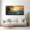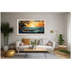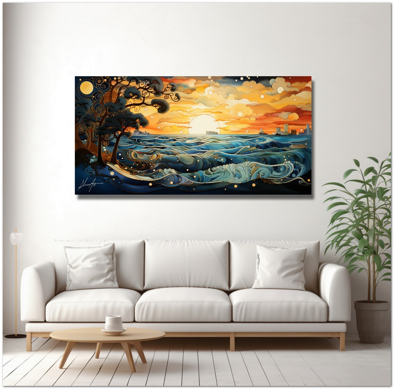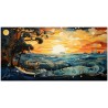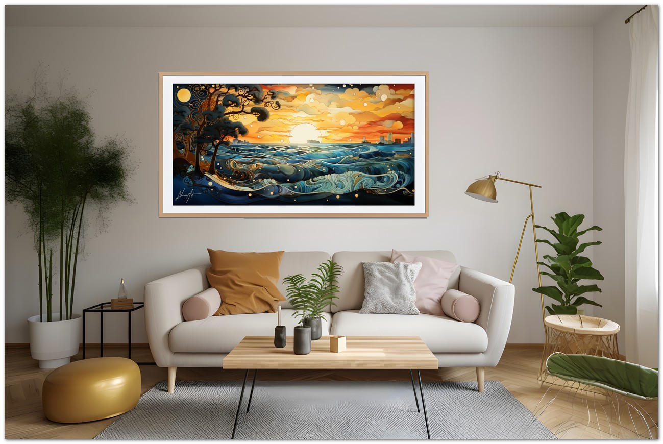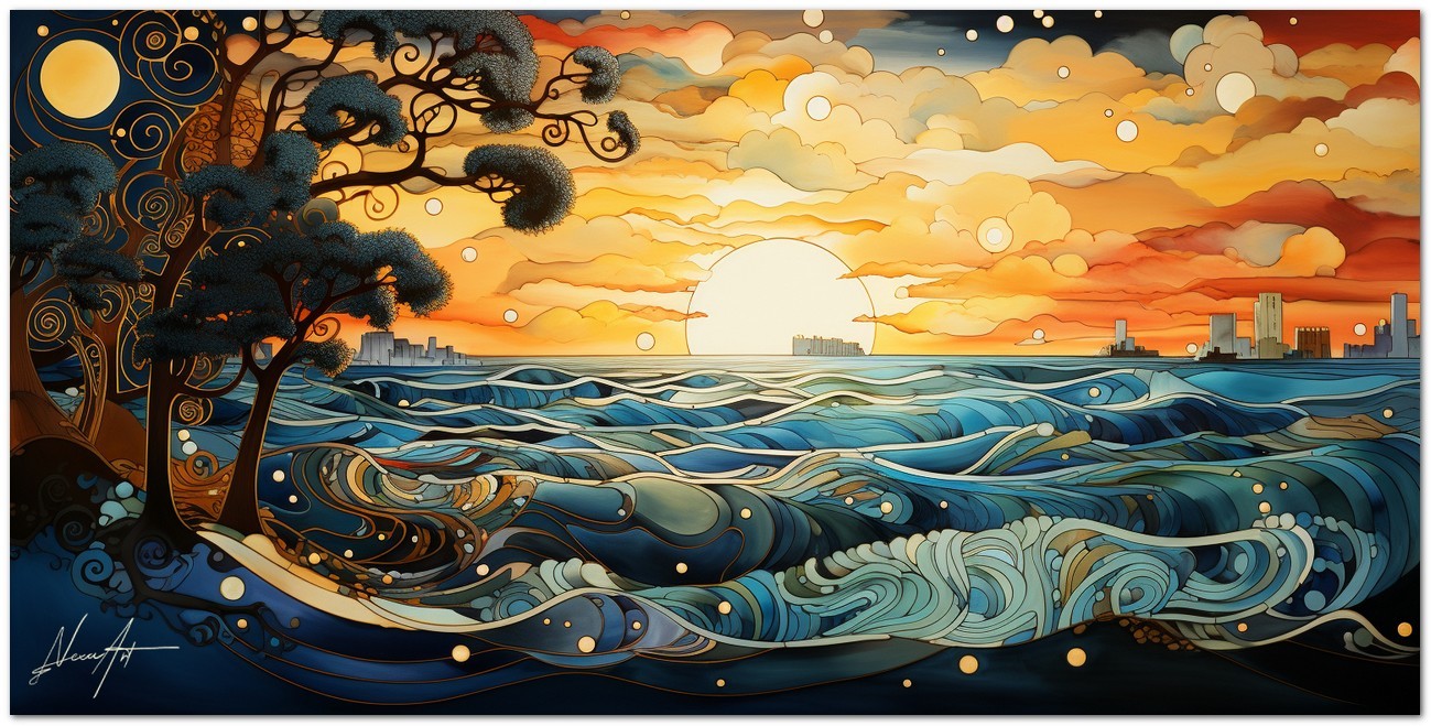 L’œuvre immortalise un coucher de soleil époustouflant où le ciel et la mer se confondent dans une étreinte chromatique. Les arbres, délimités par des lignes sinueuses et des spirales, sont les témoins silencieux de ce spectacle naturel, tandis que le soleil descend à l'horizon, peignant les nuages et les vagues de nuances d'orange, de rouge et de bleu. Processus créatif et innovation