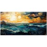 Cette œuvre numérique capture la magnifique transition de la lumière du jour à l’étreinte du soir dans un paysage marin. Le ciel est une mosaïque de nuages colorés de nuances chaudes d’orange, de jaune et de rouge, à mesure que le soleil se couche à l’horizon. Les vagues, animées de spirales et de cercles, reflètent la lumière crépusculaire et semblent danser au rythme d'une mélodie visuelle. La ville au loin, découpée sur le ciel enflammé, ajoute une impression de civilisation tranquille au spectacle naturel sauvage. Processus créatif et innovation