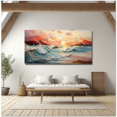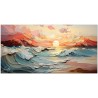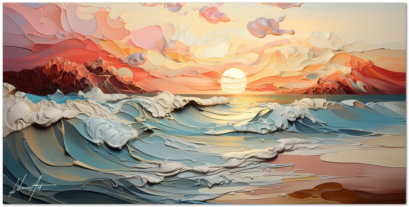 L'œuvre Alba Fluida représente une scène matinale où les premières lumières de l'aube insufflent de la chaleur dans un paysage dynamique et fluide. La composition joue avec des couches superposées qui créent une illusion de profondeur et de mouvement, avec des vagues s'écrasant doucement sur la côte et des nuages flottant au-dessus dans des formes douces et abstraites. Processus créatif et innovation