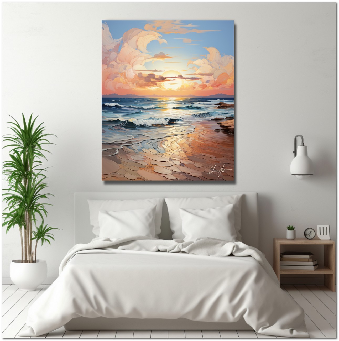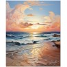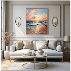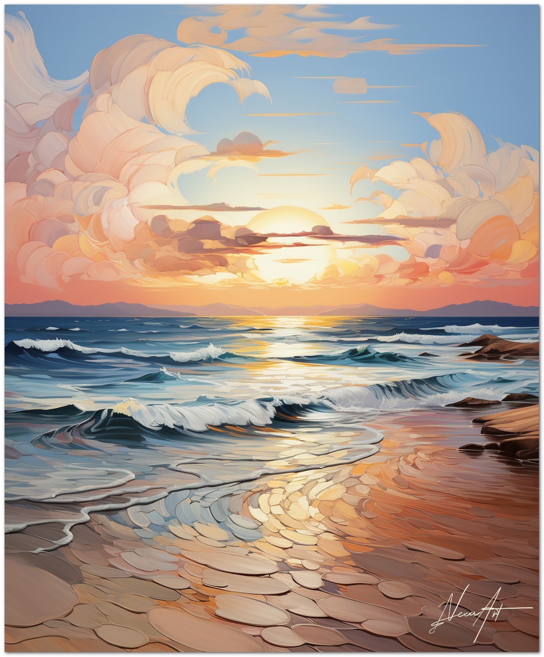 La scène Dawning of Serenity représente une aurore marine, où le soleil levant peint le ciel avec des nuances chaudes de rose et d'orange. Les vagues, animées d'un doux mouvement, semblent caresser le rivage sablonneux. Le ciel, mosaïque de nuages doucement arrondis, reflète la lumière de l'aube qui se diffuse dans un jeu de couleurs kaléidoscopique. Cette vision s'inscrit dans un style qui oscille entre le réalisme pour la précision des détails et un surréalisme évocateur pour les formes et les nuances exagérées, créant une atmosphère de calme serein et de contemplation. Processus créatif et innovation