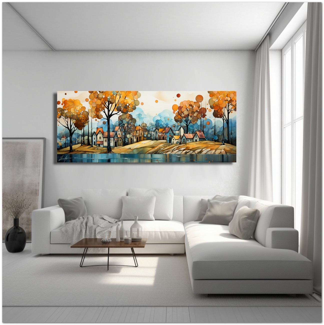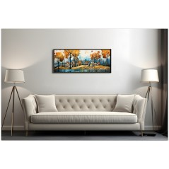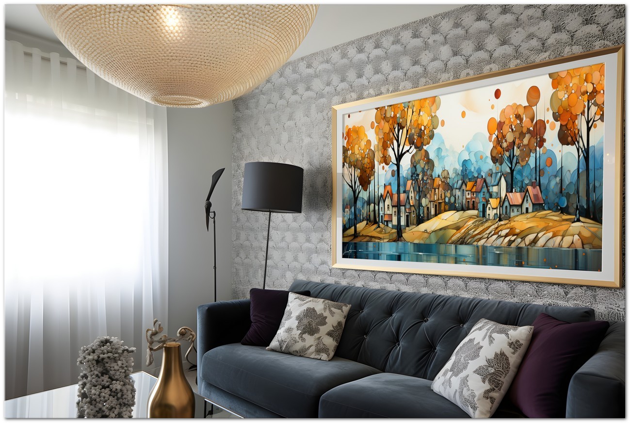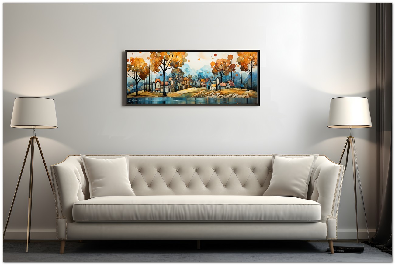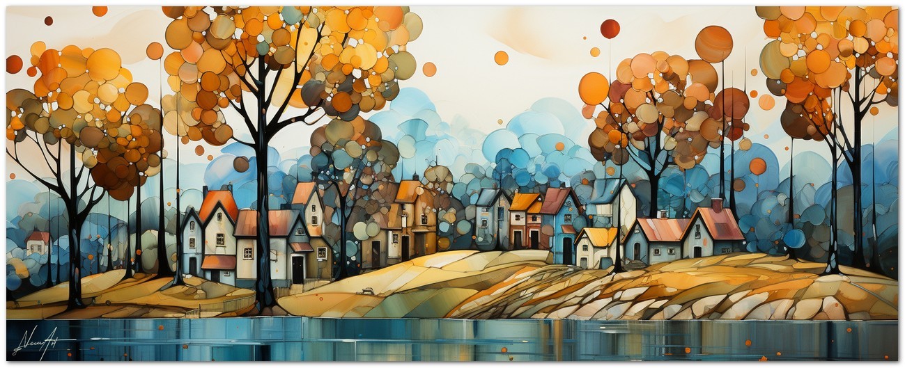 Cette création d'art numérique Chromatic Melody présente un paysage pittoresque qui semble danser au rythme d'une mélodie visuelle. Un lieu de vie paisible, où des maisons accueillantes se dressent au bord d'une rivière, sous un ciel orné d'arbres dont le feuillage ressemble à des coups de pinceau de couleurs automnales. La palette utilisée par l'artiste utilise des nuances chaudes allant du jaune doré au bleu profond, suggérant une atmosphère de sérénité et de chaleur. Le reflet sur l’eau ajoute de la profondeur et une dimension presque onirique à la scène. Processus créatif et innovation