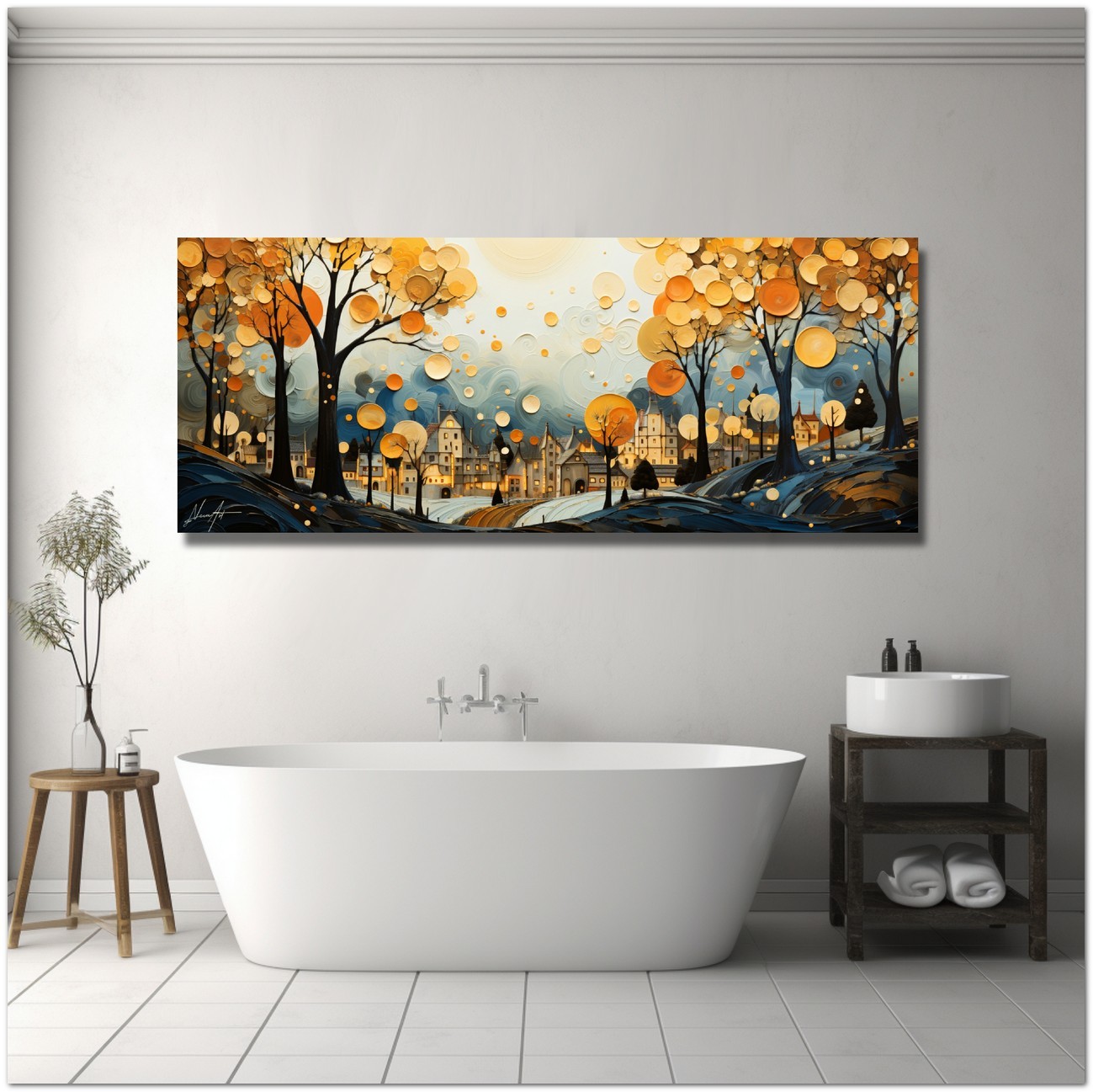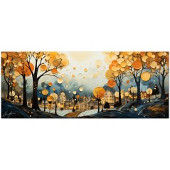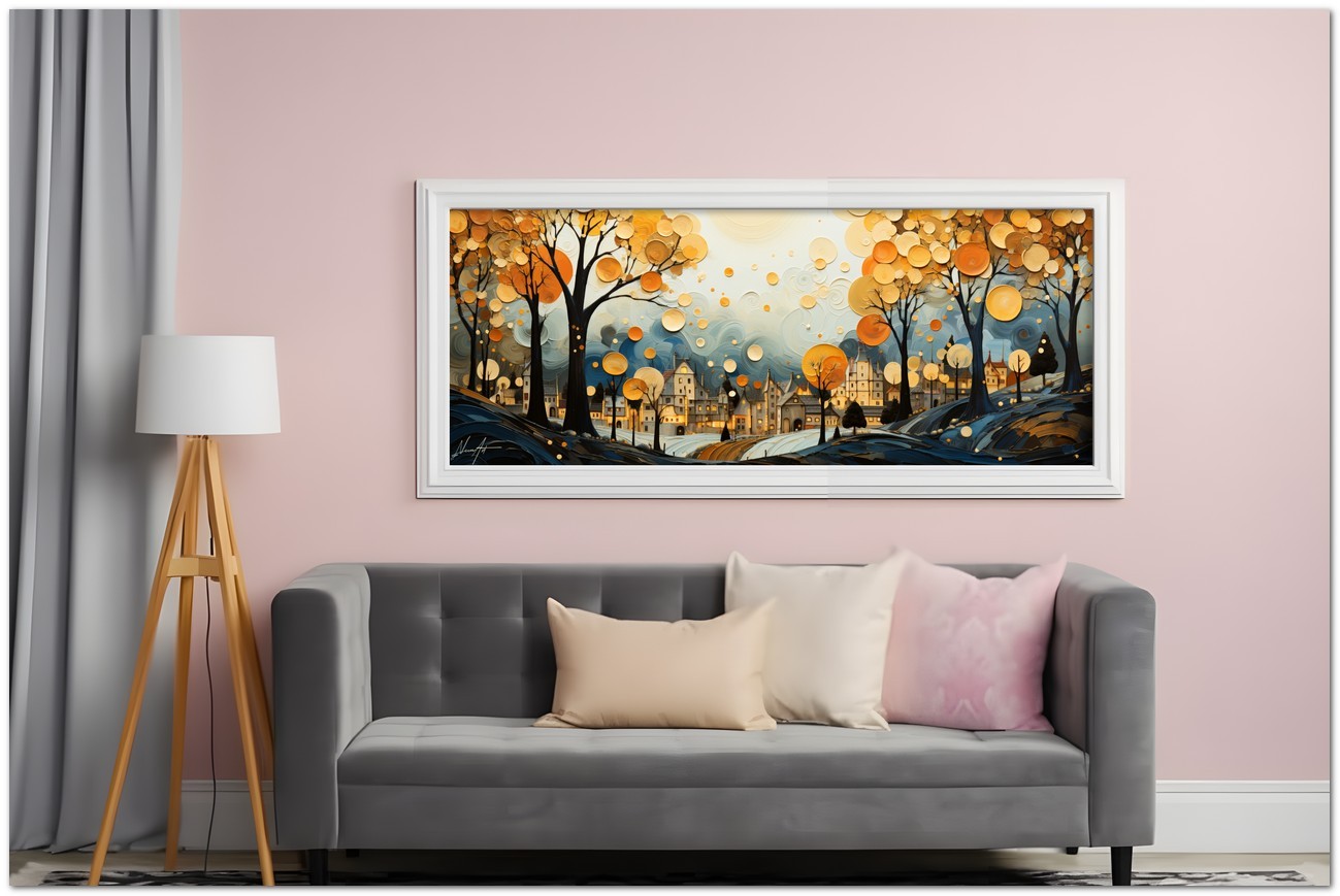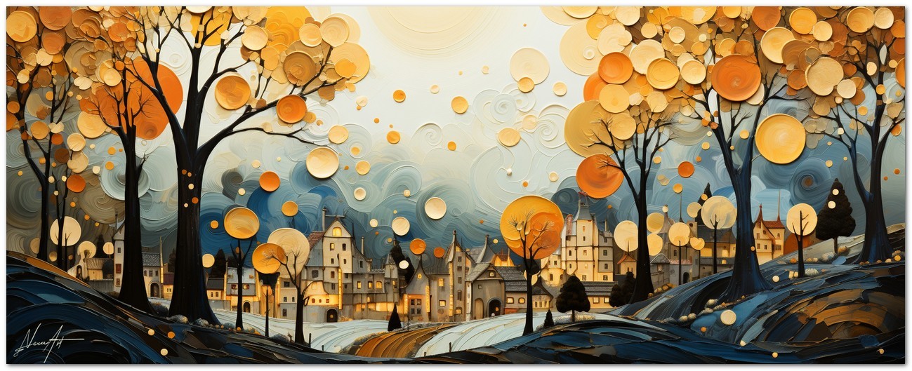 Dans cette œuvre numérique Golden Vesper, nous assistons à une scène de la vie quotidienne plongée dans une lumière dorée du soir. Les arbres aux feuilles transformées en une myriade de tons chauds, de l'orange au jaune vif, se fondent dans un ciel qui semble danser dans un vortex de nuages stylisés. Des maisons pittoresques parsèment le paysage, créant un sentiment de communauté calme et idyllique. La rivière qui traverse la scène reflète l’atmosphère magique du ciel, ajoutant une sensation de mouvement et de fluidité à l’ensemble de la composition. Processus créatif et innovation