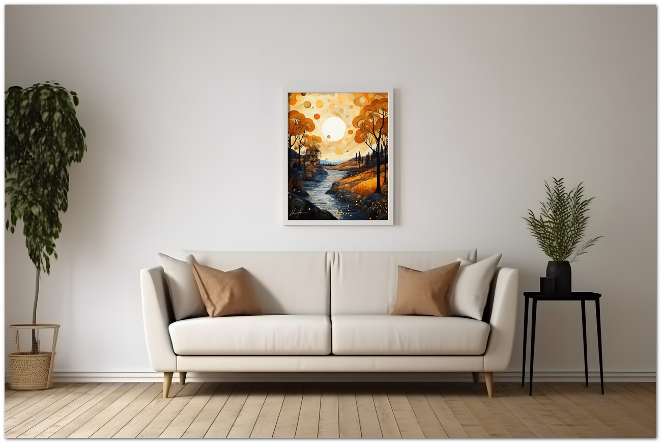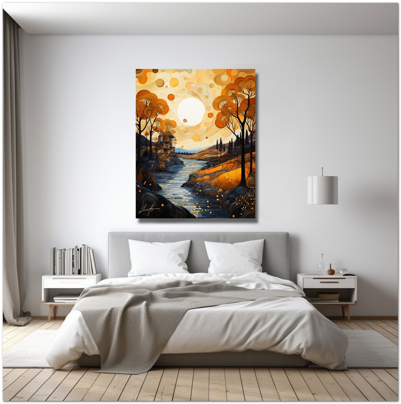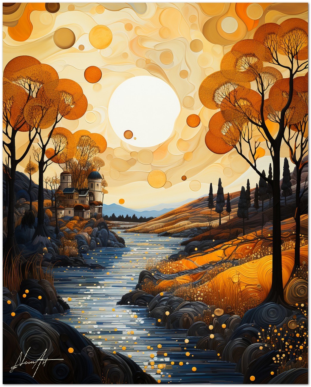 Cette création numérique The Soul of the River peint un coucher de soleil enchanteur où le ciel et la rivière se confondent dans un jeu kaléidoscopique de couleurs chaudes. Les teintes dorées du coucher de soleil se reflètent dans l’eau, créant un chemin chatoyant qui mène le regard vers l’horizon lointain. Les arbres se détachent comme des silhouettes sur le ciel lumineux, leurs branches nues et leurs feuilles dorées évoquant la fin de l'automne et l'approche de l'hiver. L'architecture aux lignes simples suggère une communauté harmonieuse, intégrée à la nature. Processus créatif et innovation