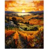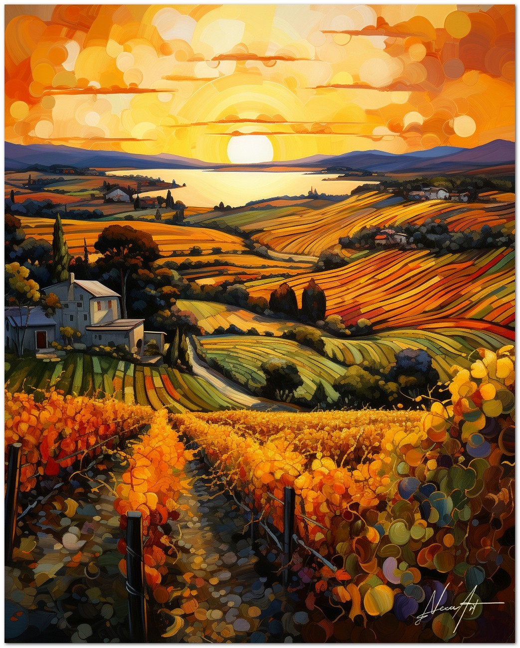 L'œuvre Langhe al Crepuscolo capture la magnificence d'un coucher de soleil sur les collines d'une région viticole, où les rangées de vignes se transforment en une mer d'or sous la chaleur du soleil déclinant. Le style de peinture est vif et expressionniste, avec des coups de pinceau audacieux et une riche palette de jaunes, d'oranges et de rouges qui créent une texture visuelle dynamique et enveloppante. Le ciel, mosaïque de cercles superposés, reflète la vitalité de la terre, suggérant l'idée d'un univers dans lequel tout est interconnecté. Processus créatif et innovation