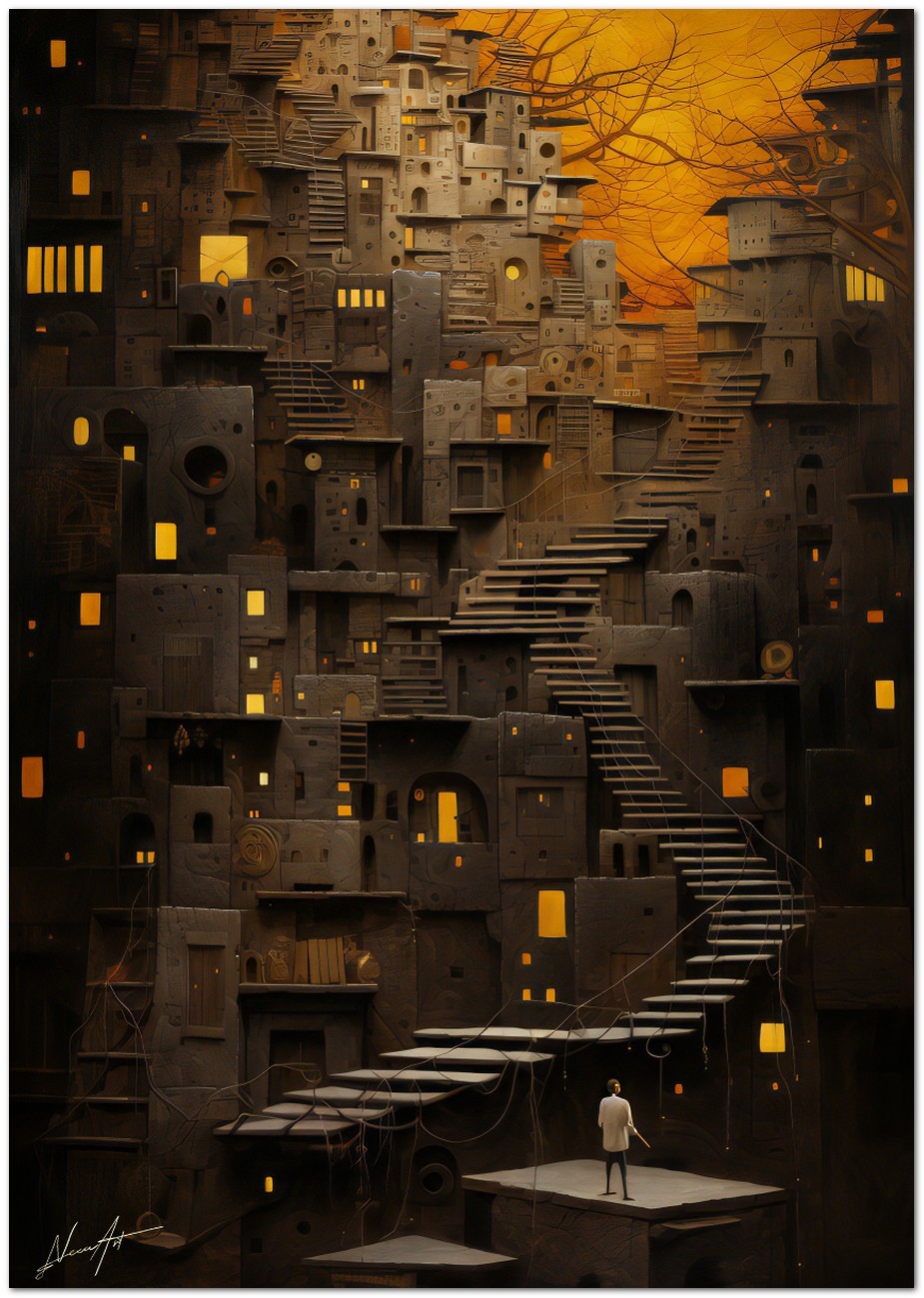 "The Man of Urban Time" est une œuvre numérique qui met en scène un homme dans un contexte urbain, positionné sur un escalier et vêtu d'une chemise blanche. Tenant un bâton à la main, sa silhouette devient le centre de la composition, encadrée par un paysage urbain. Le détail d'un mur noir avec une bande jaune à droite de l'homme offre un contraste de couleurs et ajoute un élément d'intérêt visuel à l'œuvre. Détails de l'œuvre « L'Homme du temps urbain » : classification, techniques et styles
