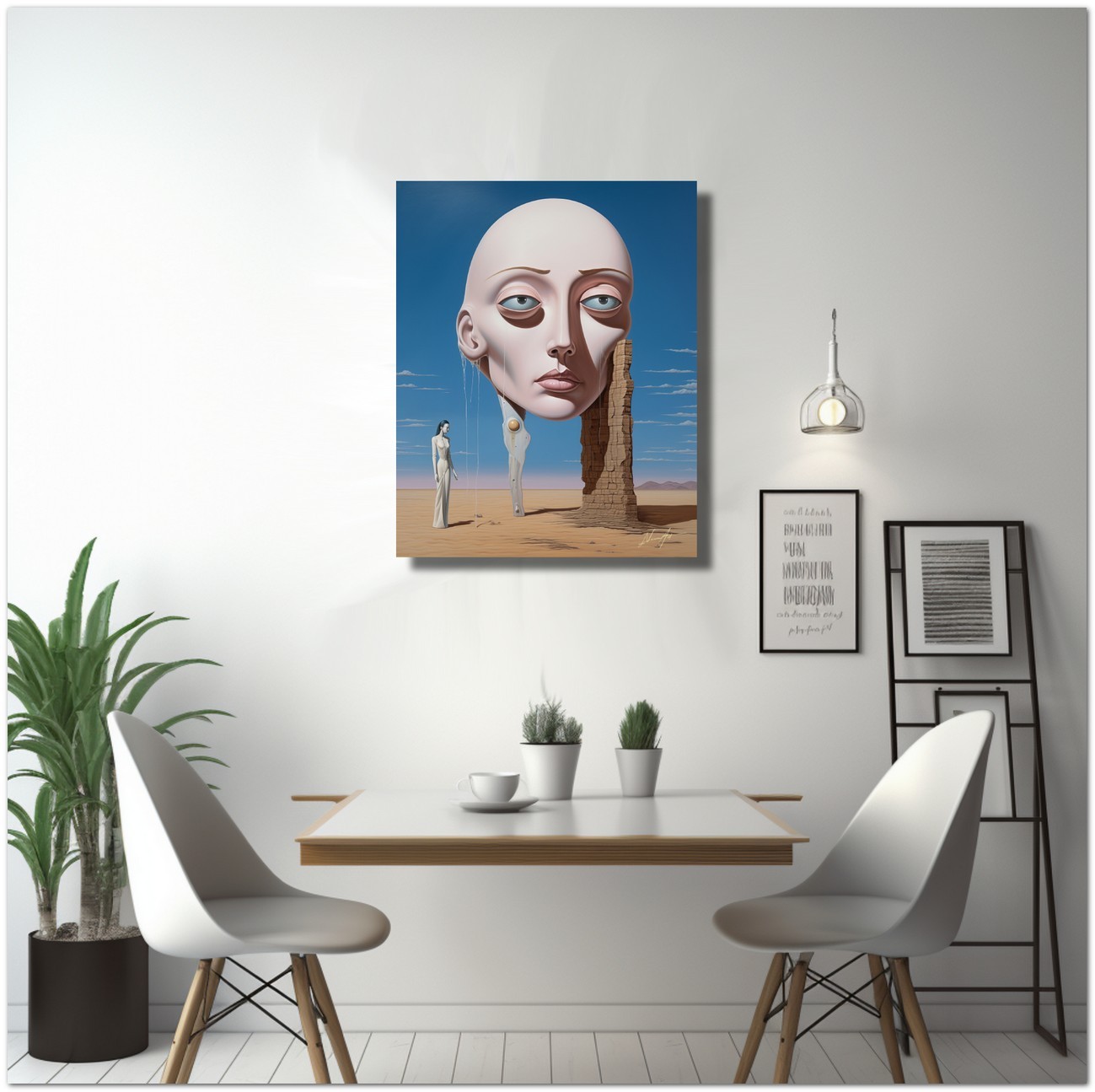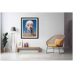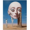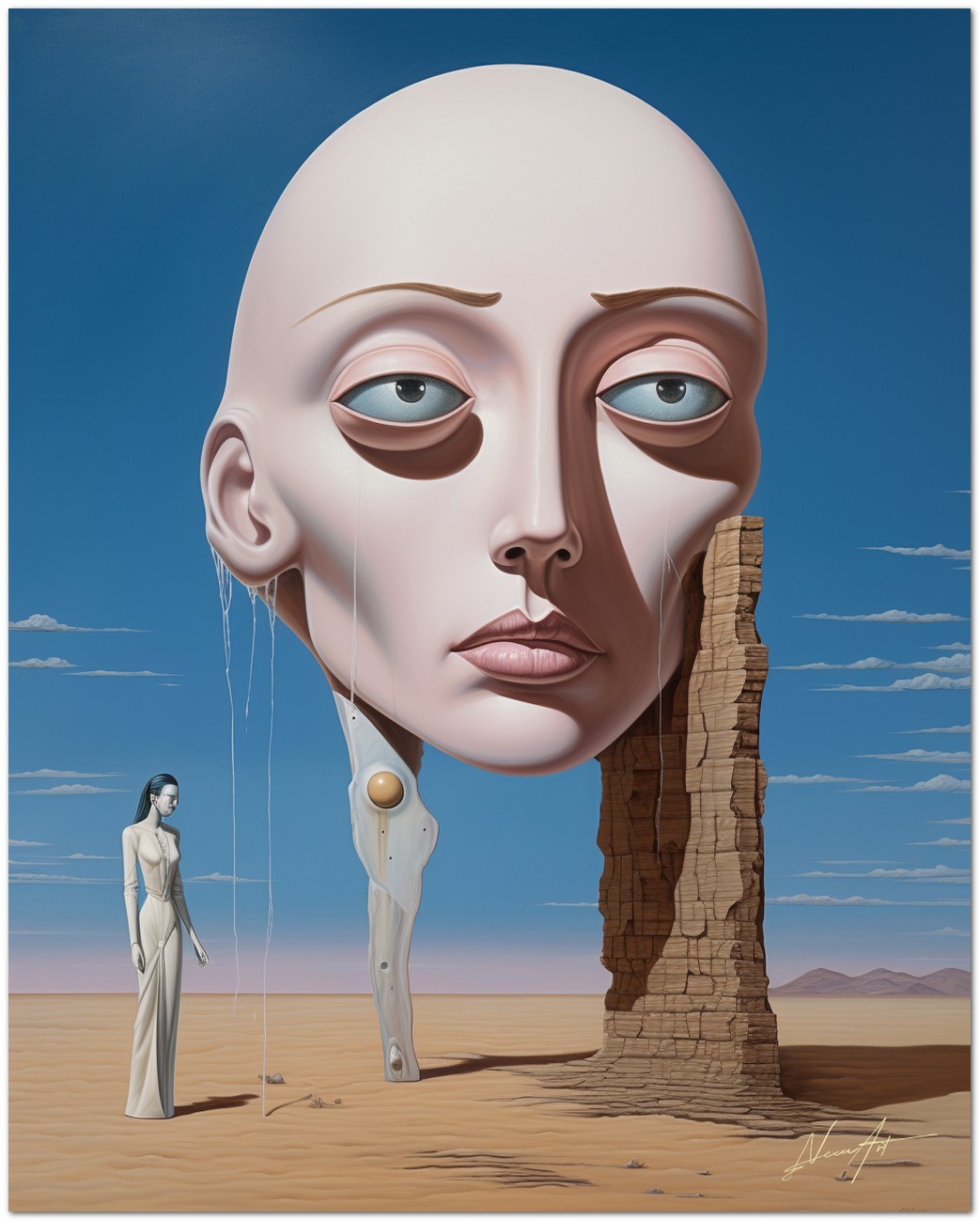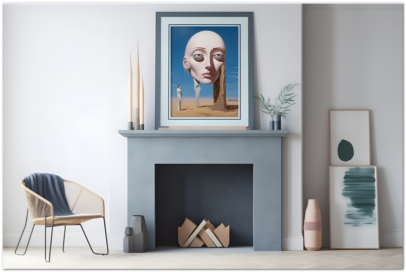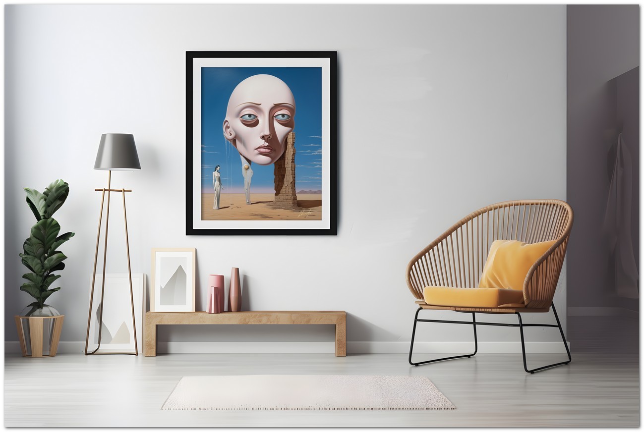 "Enigma nel Deserto" est une œuvre numérique qui explore le contraste entre la solitude du désert et la présence énigmatique d'une figure féminine. Au centre du tableau, une femme vêtue d'une robe blanche fluide se tient au milieu d'un paysage désertique, à côté d'une tête de femme de taille massive, créant un élément surréaliste. L'œuvre mêle magistralement le réalisme, représenté par le portrait détaillé de la femme, avec l'abstraction, à travers l'utilisation de formes et de couleurs qui évoquent un sentiment de mystère et d'intrigue. Détails de l'œuvre « Enigme dans le désert » : classification, techniques et styles