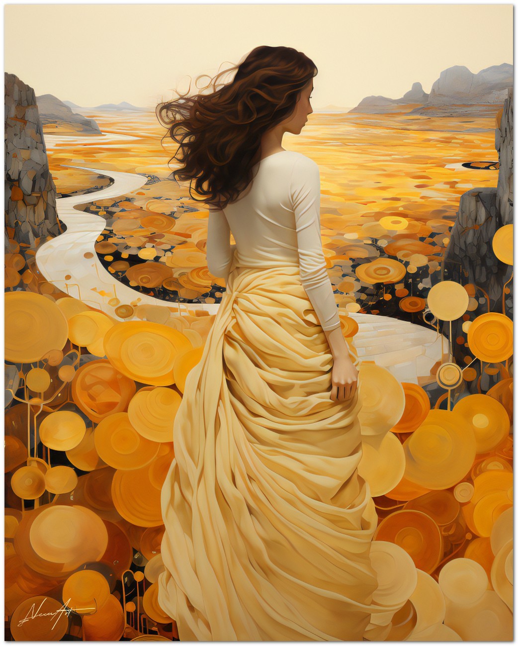 "Yellow Lady" est une œuvre numérique qui capture l'essence de la grâce et de la beauté féminine. Au centre de la composition, une femme élégante vêtue d’une robe jaune vif est entourée d’un environnement naturel vibrant et coloré. L'artiste a habilement capturé non seulement sa grâce, mais aussi l'harmonie de la figure féminine avec son contexte, créant une œuvre qui est un triomphe de couleur et de détail. Détails de l'œuvre 'Dame Jaune' : Classification, Techniques et Styles
