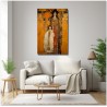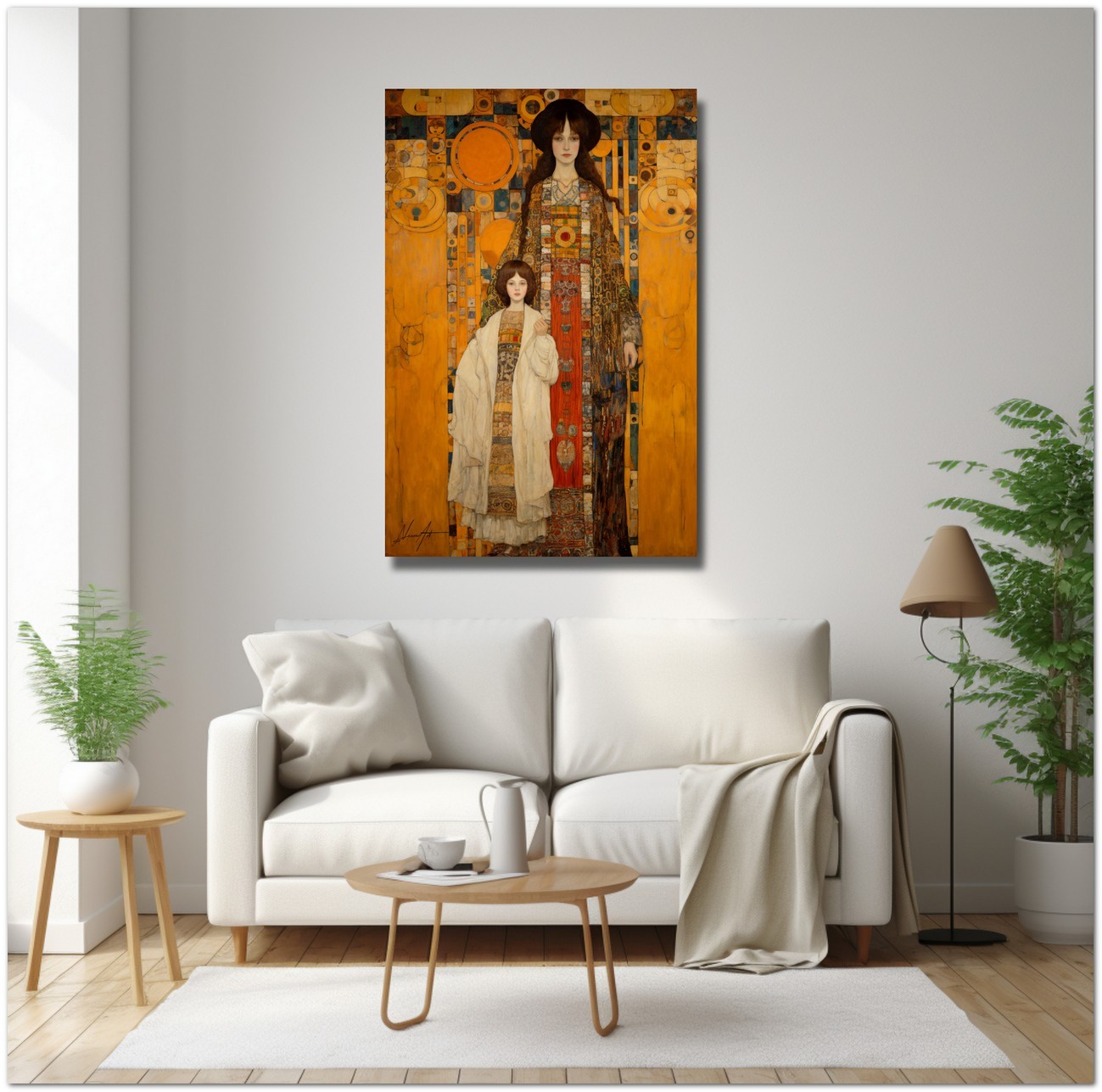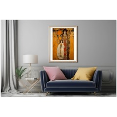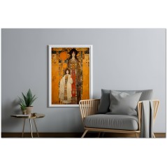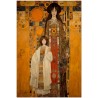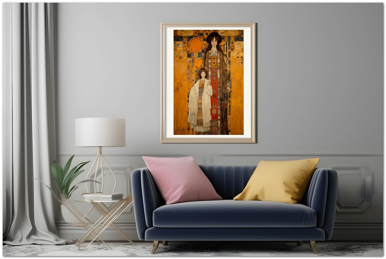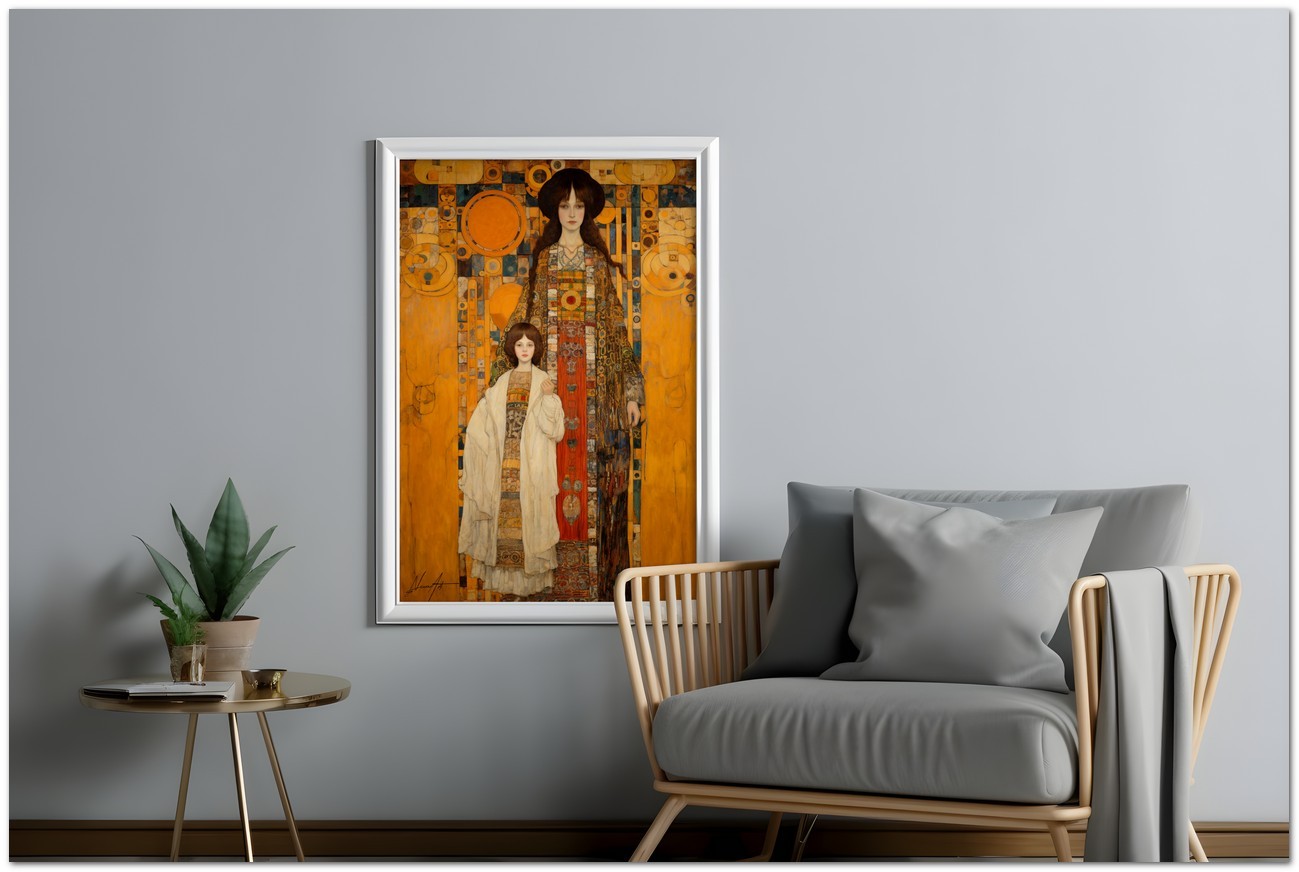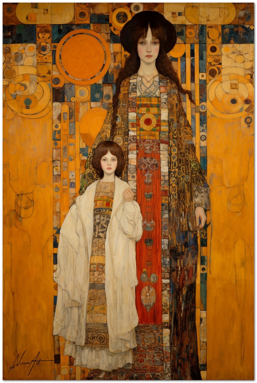 Dans cette création numérique, deux figures féminines à l'allure solennelle se détachent sur un fond complexe de géométrie et de symboles. Le style pictural fait référence à la Sécession viennoise, avec une fusion d'éléments Art Nouveau et de symbolisme. La palette de couleurs est dominée par des tons ocre et terre, enrichis par des accents vibrants de bleu et de rouge. Processus créatif et innovation
