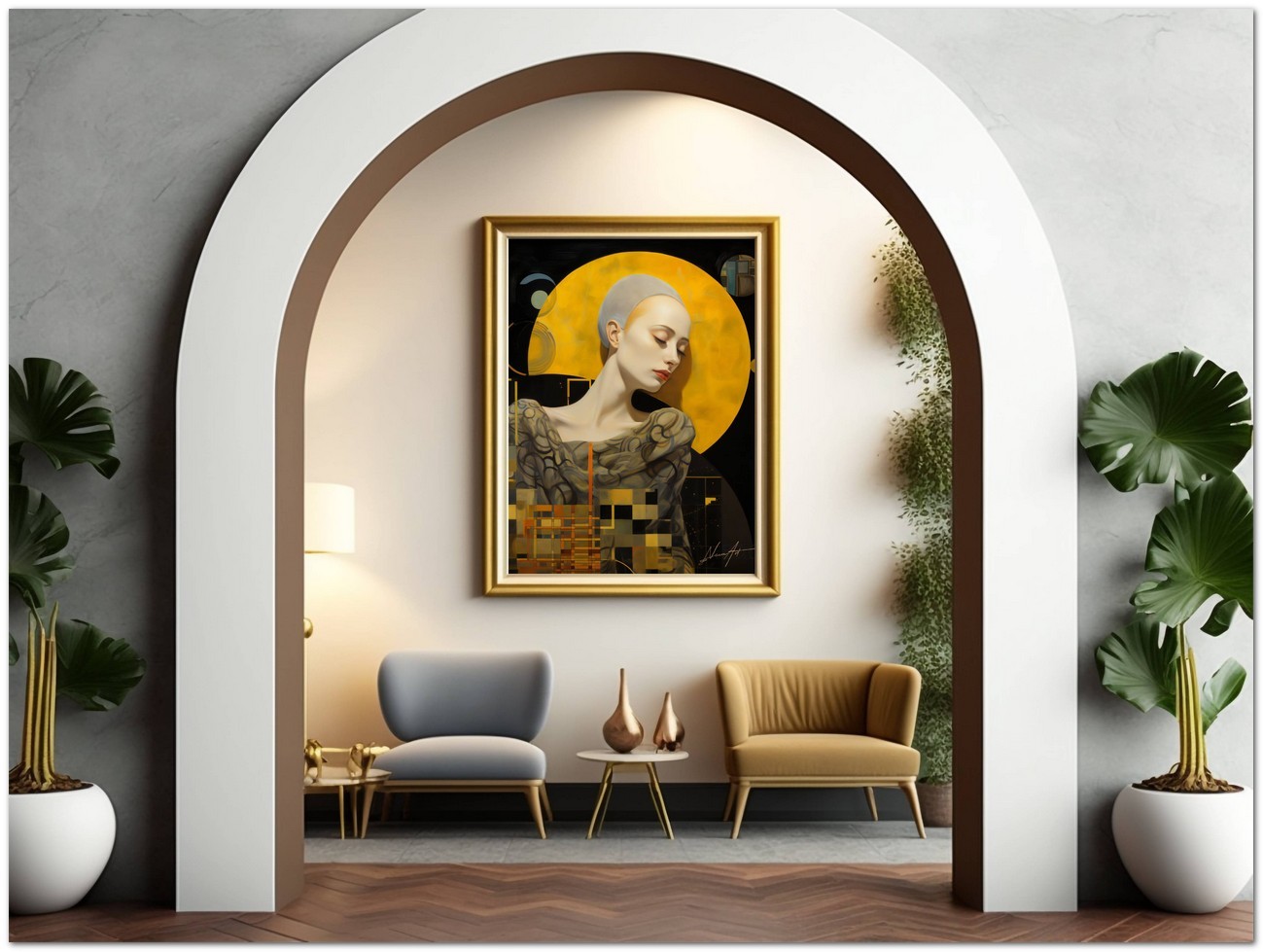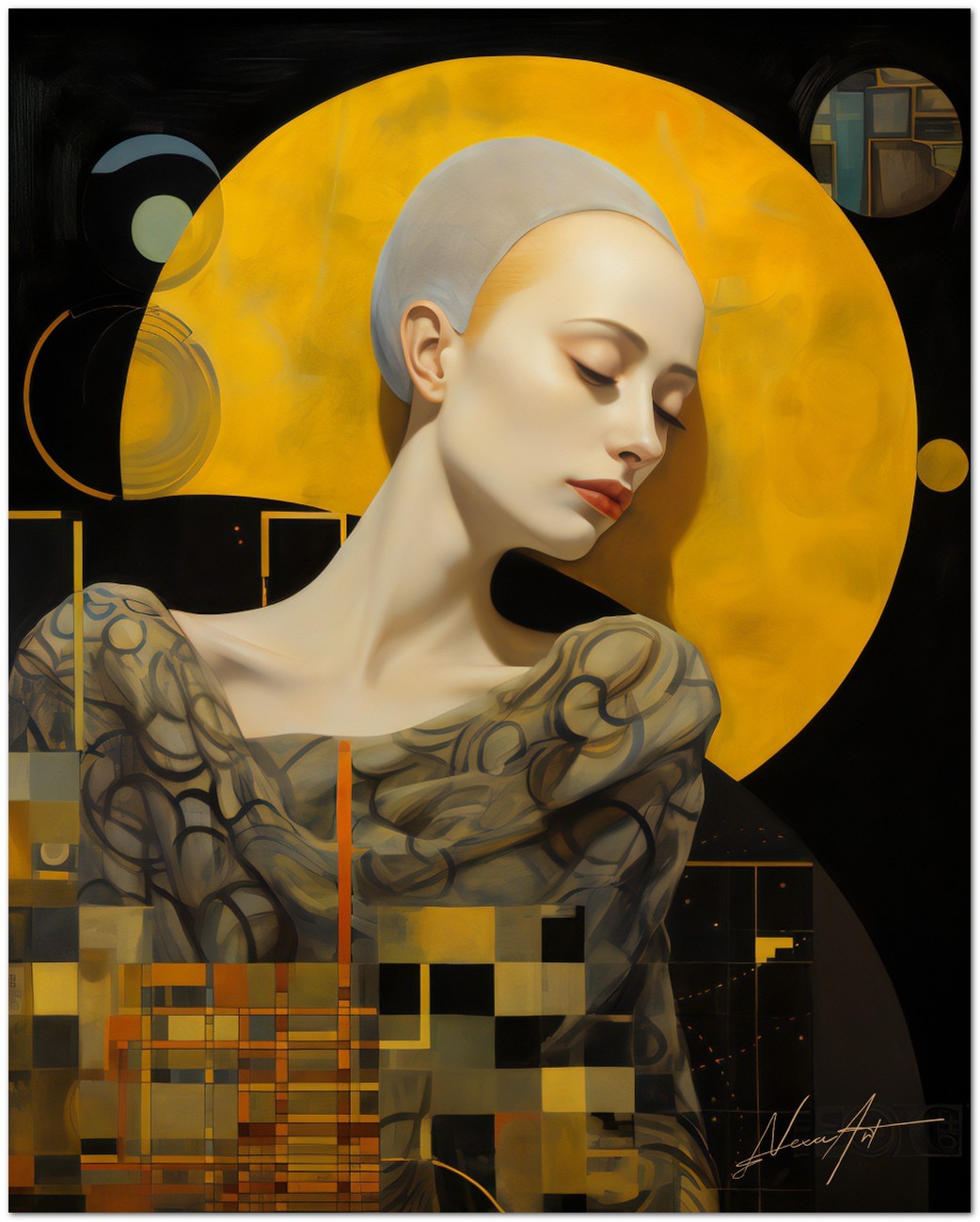 "L'Endormi dans le Cosmos" est une œuvre qui incarne un rêve cosmique, représentant une figure féminine immergée dans un univers de couleurs vibrantes et de formes géométriques. La femme, au centre de l'image, apparaît dans un état de contemplation tranquille ou de sommeil, entourée d'éléments qui rappellent l'immensité et le mystère de l'univers. Synergie entre art et technologie
