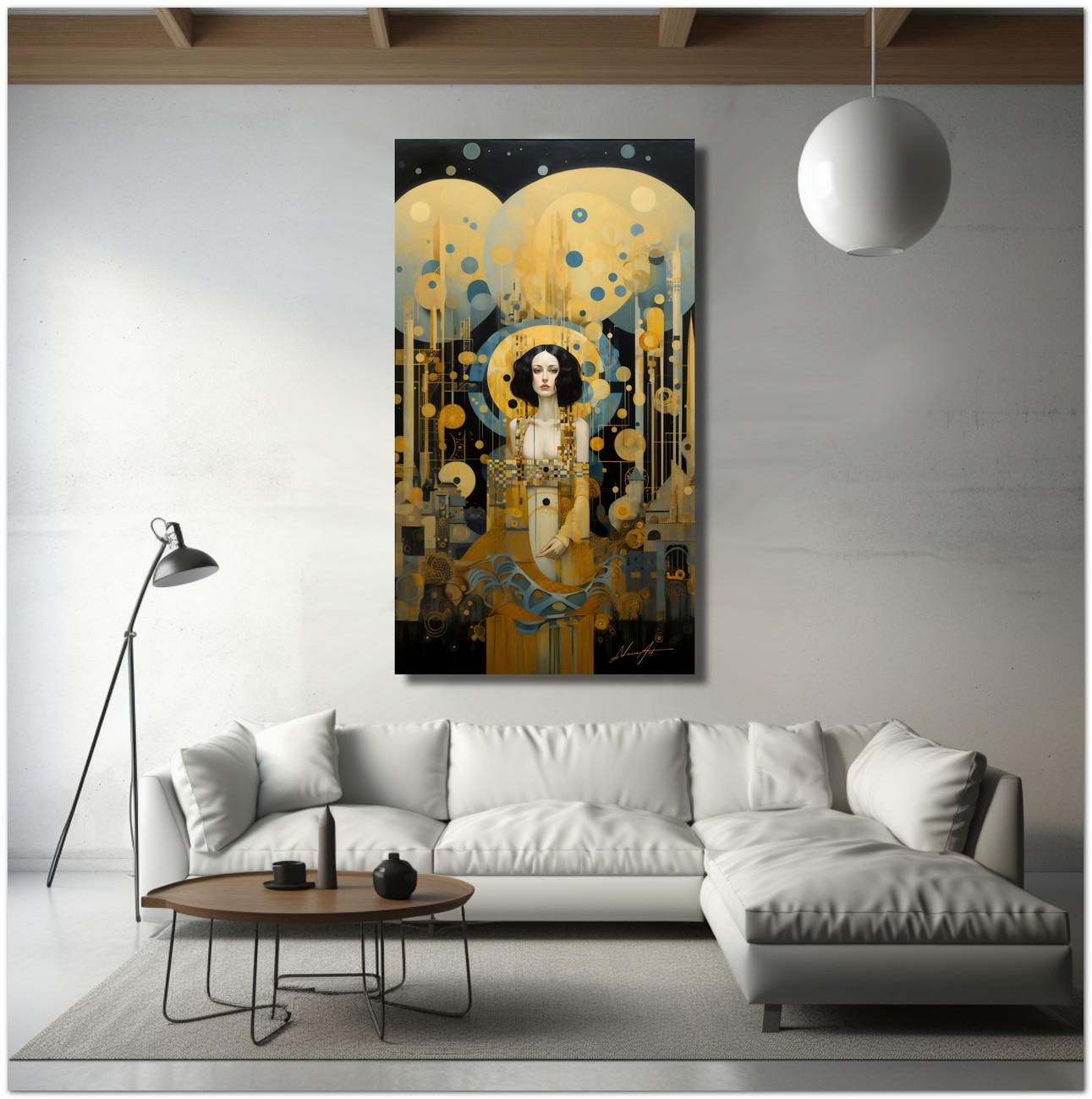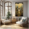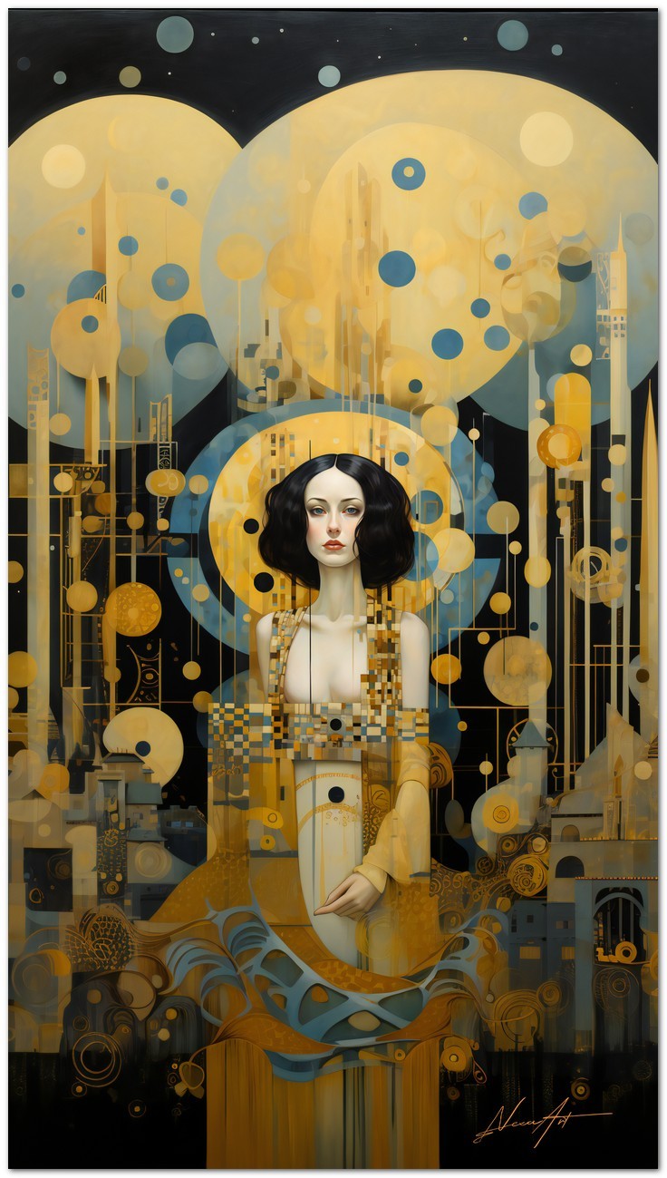 "Risonanza Dorata" est une œuvre qui met en valeur l'élégance et le charme. Il représente une femme vêtue d'une robe dorée qui capture tout le champ visuel de la toile. Ses cheveux noirs, ornés de pois, s'accordent parfaitement avec la robe, créant un charmant contraste visuel. L'artiste a intelligemment utilisé une palette de couleurs or et noir pour rehausser la robe, en ajoutant des nuances de bleu pour donner de la profondeur et rendre l'image visuellement intrigante. Détails de l'œuvre 'Golden Resonance' : Classification, Techniques et Styles