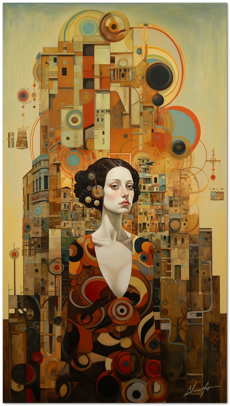 « La femme de la métropole ascendante » est une représentation numérique vibrante qui capture la dynamique d'une ville en constante expansion verticale. Au centre de l’œuvre, une femme vêtue d’une robe orange se détache sur un fond complexe de bâtiments superposés, symbolisant le désir d’espace dans une métropole qui s’étend vers le ciel. La densité des bâtiments, superposés, reflète l'ambition et la complexité d'une ville qui aspire à conquérir de nouveaux sommets. Détails de l'œuvre « La Femme de la Métropole Ascendante » : Classification, Techniques et Styles